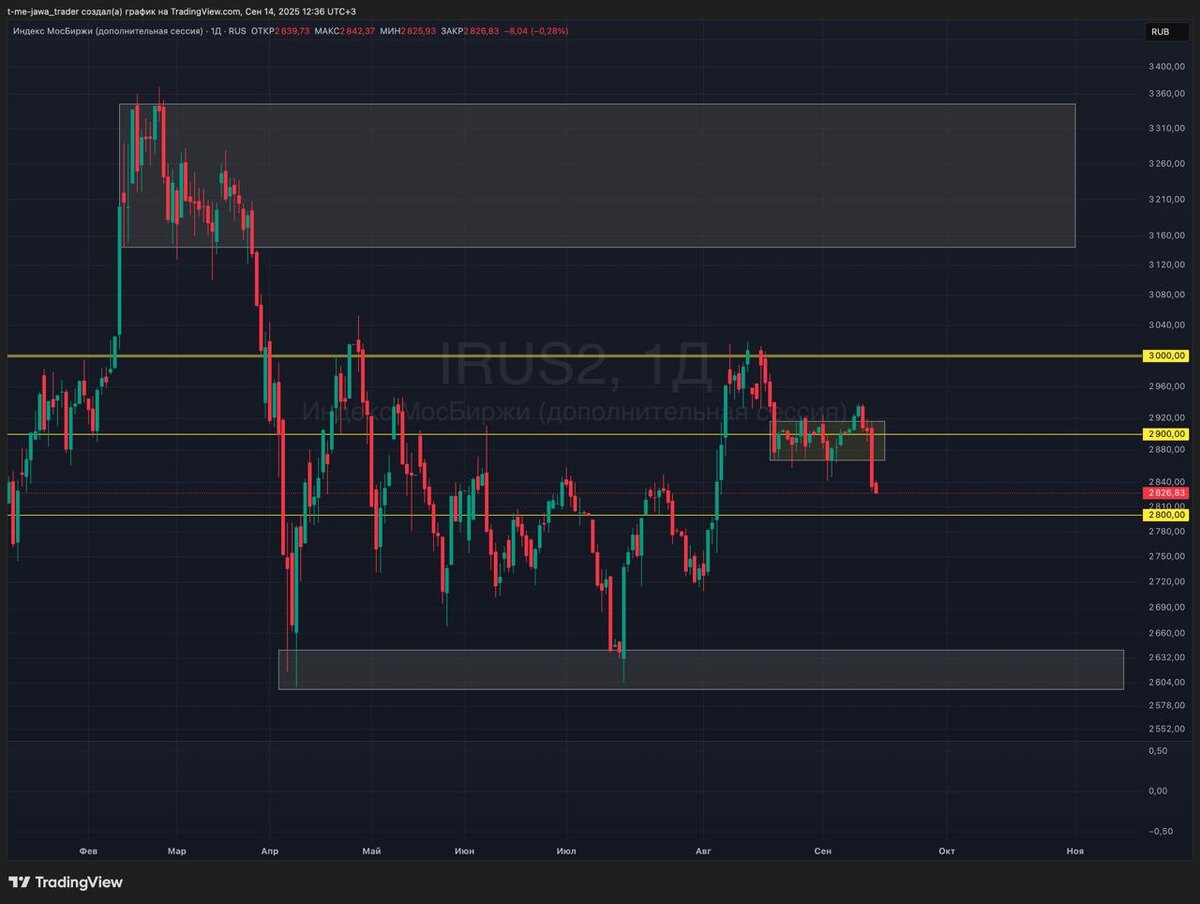 Всех приветствую! Долгое время на рынке не происходило ничего интересного, ровно до пятницы 12 сентября. В прошедшую пятницу собрались воедино несколько факторов: 1️⃣ Новости о снижении ставки ЦБ лишь на 1%, хотя большинство ожидало 2% 2️⃣ Внезапные информационный вброс о новых санкциях, который и добил рынок вниз В технической точки зрения, Индекс Мосбиржи 🇷🇺 $IMOEXF $MXU5 $MMU5 рисует крайне негативную картину. Неделю закрываем на лоях с пробоем ближайшей поддержки. Почти наверняка добьют рынок до 2800, а может даже и ниже, будем наблюдать. 🟢 В целом, если анализировать внешний фон, то обвально падать нам не на чем. Но рынок остается крайне новостным и на новостях можем улететь как вниз, так и наверх. В таких условиях техника работает плохо и может давать сбои. ❗️Все-таки склоняюсь к мысли, что такой эмоциональный пролив был в большей степени на страхе новых санкций. В понедельник ЕС должен объявить о новых санкциях. Не думаю, что они смогут изобразить что-то реально новое, с