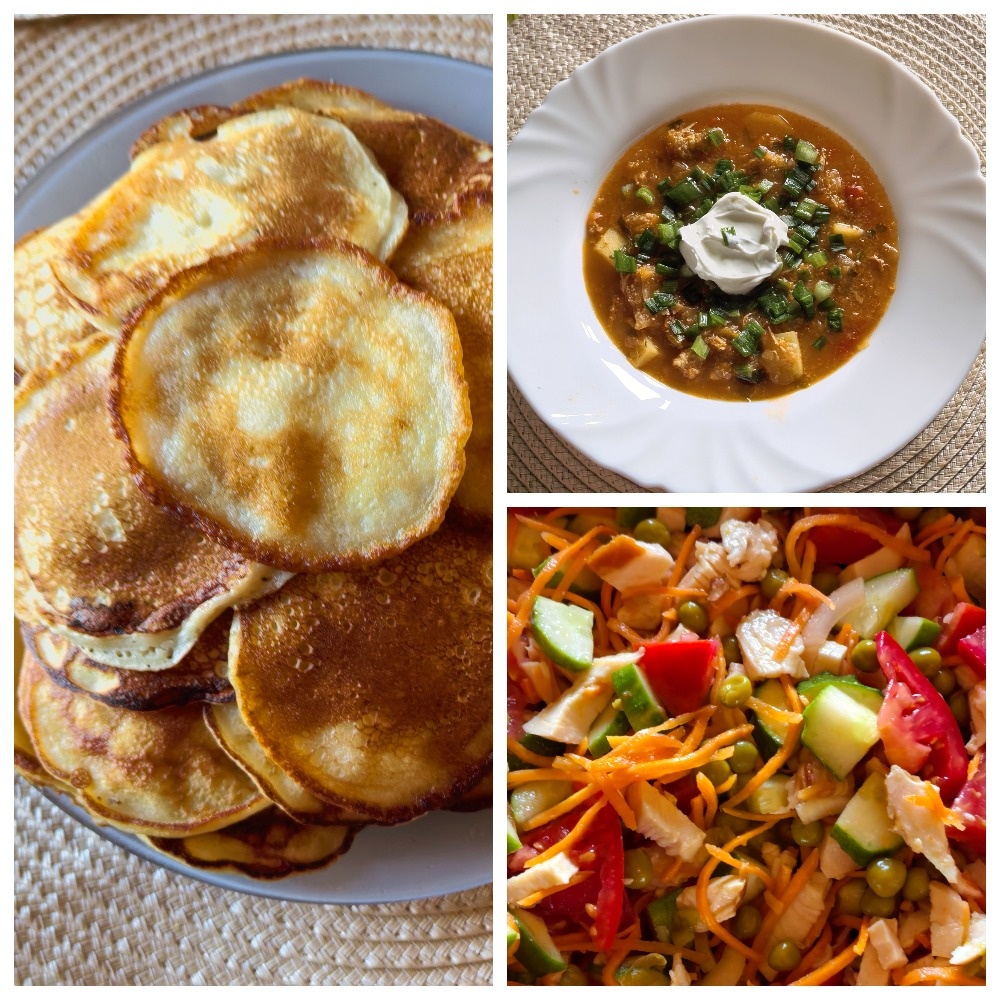 * Сегодняшнее меню без выпечки и компота. У меня дома идёт ремонт и мне бывает некогда готовить выпечку и варить компот. 2 куриных яйца, 2 ст. л сахара, соль щепотка, 1 ч. л соды, 500 мл. кефира и 500 мл. молока. Все хорошо перемешать до однородности венчиком. Добавить муку замесить тесто ( муки нужно чуть меньше , чем на оладьи. Чтобы тесто было похоже на 10 % сметану когда ее перемешать!). Жарить мини блинчики на сковороде с двух сторон, выкладывая большой кулинарной ложкой. Подаём с вареньем, джемом, мёдом, сметаной и горячим чаем. Приятного аппетита. 1 банка тушёнки любой ( у меня из индейки) 250 грамм свежей капусты нарезать. 2 картофелины очистить и нарезать кубиками или соломкой. 1 большая морковь очистить и натереть на крупной тёрке. 2 средних луковицы очистить и нарезать мелко. 200 грамм сладкого перца очистить от семян и нарезать произвольно. Помидоры 2 средних штуки нарезать крупным кубикам. 200 грамм квашеной капусты промыть. 1 ч. л томатной пастой.