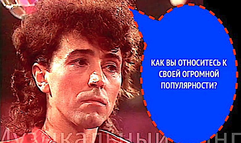 "У меня вот такой вопрос: после каждого вашего ответа возникают аплодисменты, то, что, видимо, связано с вашими хорошими ответами, это редко бывает на нашем ринге, и поэтому у меня вопрос такой. Во-первых, 1 — точнее, вопрос: какими, на ваш взгляд, должен обладать качествами певец, знаменитый певец, выступающий, кроме хорошего голоса? И второй вопрос, связанный с вашей популярностью: как вы к ней относитесь и, в принципе, хотели бы вы, ведь мы знаем, что много у вас чистых поклонников, которые увлекаются только Леонтьевым, больше ничего не признают, хотели бы вы, чтобы у нас, скажем, в Советском Союзе создавались клубы имени Леонтьева, фан-клубы и так далее?"
