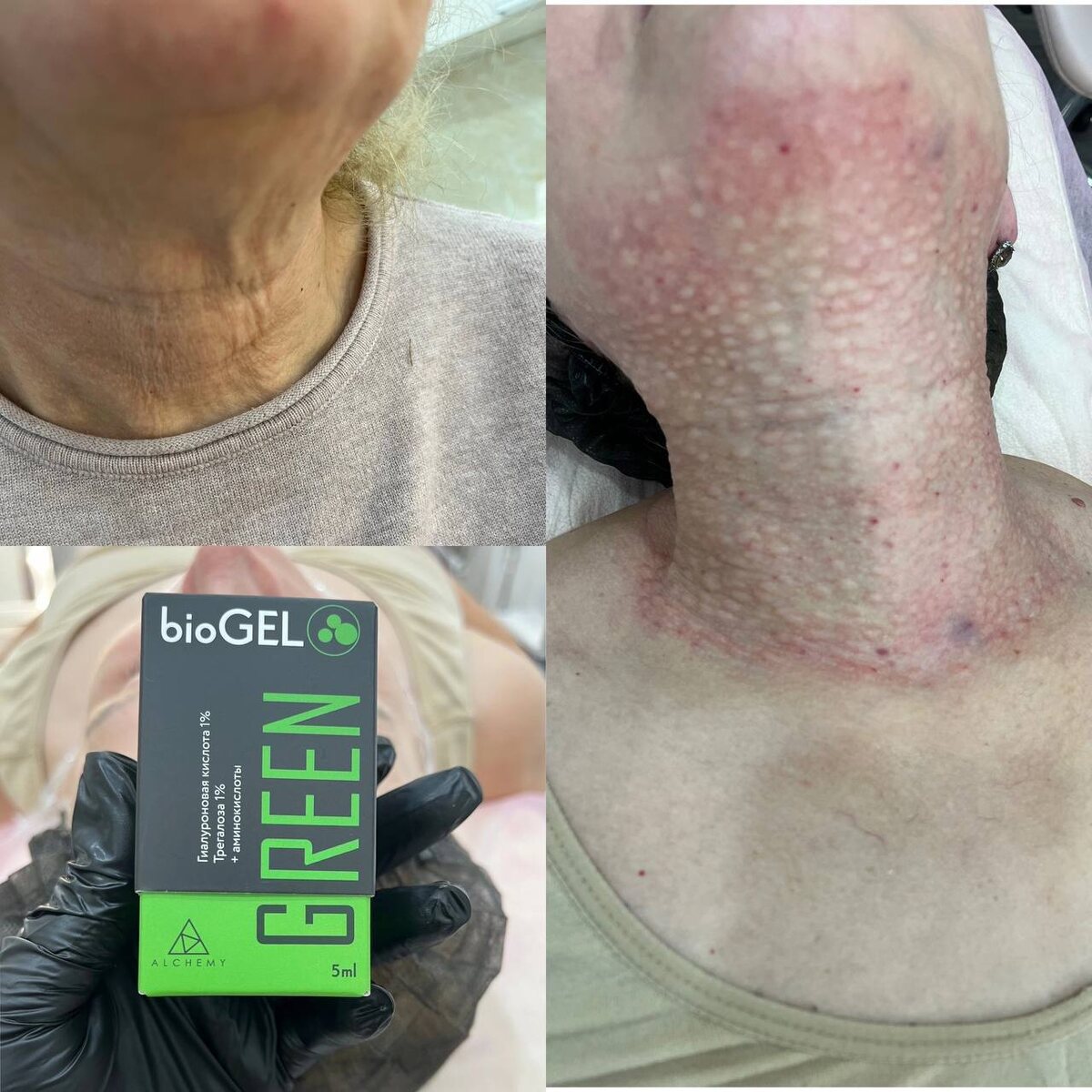💫Дряблость кожи шеи — к сожалению уже выраженный признак возрастных изменений. Вертикальные и горизонтальные борозды, свисающие кожные складки шейной зоны говорят о потере упругости и эластичности кожи, водном дисбалансе в тканях, замедлении процессов клеточного метаболизма и выработки «каркаса» тканей дермы — коллагеновых волокон. В зависимости от индивидуальных особенностей пациента и степени выраженности проблемы, я использую разные методы омоложения кожи. 🔥В bioGEL Green используется высокая концентрация трегалозы, что позволяет достичь видимых результатов уже после первого применения ✅ Показания: ✅выраженные возрастные изменения ✅глубокие мимические и статические морщины ✅истончение дермы ✅подготовка и реабилитация после агрессивных методик (химические пилинги, лазерная шлифовка) ✅ снижение тонуса кожи шеи , лица , декольте , рук