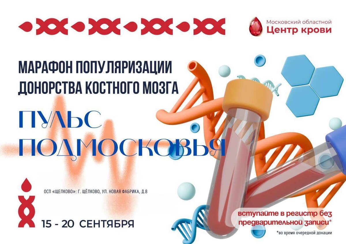 Марафон «Пульс Подмосковья» в Щёлкове 🩸 Когда лечение и химиотерапия не могут обеспечить выздоровление, трансплантация костного мозга становится единственным шансом на спасение жизни пациента с тяжёлым заболеванием. 🩸 Найти своего генетического близнеца — подходящего донора — невероятно сложно. Его может не быть среди родственников, и тогда надежда остаётся только на регистр доноров костного мозга. Спасти жизнь человеку проще, чем кажется — для этого нужно пройти типирование (сдать анализ крови на определение вашего генетического кода). ❤️ Щёлковское отделение областного Центра крови отменяет предварительную запись на типирование с 15 по 20 сентября. 💔 Сообщите о желании вступить в регистр в регистратуре. 💔 Заполните специальные согласия. 💔 После стандартной донации у вас возьмут одну дополнительную пробирку для типирования. 💔 Ваши данные занесут в базу. Чтобы стать донором цельной крови, необходимо: 💔 Взять на донацию оригинал паспорта, СНИЛС, временную регистрацию (при о