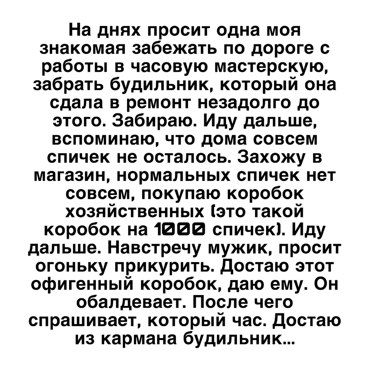 На днях просит одна моя знакомая забежать по дороге с работы в часовую мастерскую, забрать будильник, который она сдала в ремонт незадолго до этого. Забираю. Иду дальше, вспоминаю, что дома совсем спичек не осталось. Захожу в магазин, нормальных спичек нет совсем, покупаю коробок хозяйственных (это такой коробок на 1000 спичек). Иду дальше. Навстречу мужик, просит огоньку прикурить. Достаю этот офигенный коробок, даю ему. Он обалдевает. После чего спрашивает, который час. Достаю из кармана будильник...