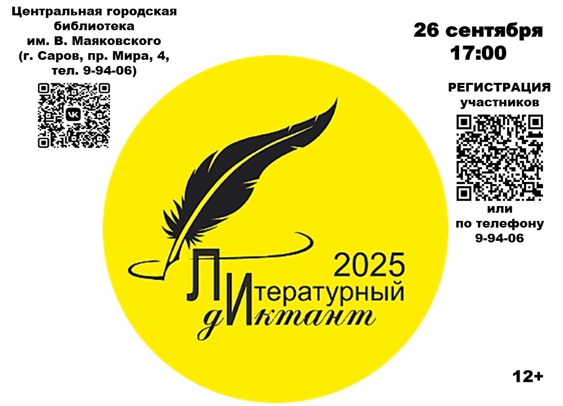 ↗ Продолжается регистрация на Литературный диктант Международная акция пройдет в Сарове в третий раз 26 сентября в 17:00 в библиотеке имени В.Маяковского. Участников ждут 20 занимательных вопросов по классической и современной литературе в тестовой форме. Для участия необходимо зарегистрироваться любым способом: - по телефону 9-94-06 (отдел методической и инновационной деятельности) - по ссылке: https://forms.yandex.ru/u/68b6def2e010db3973d32410 - или по QR-коду