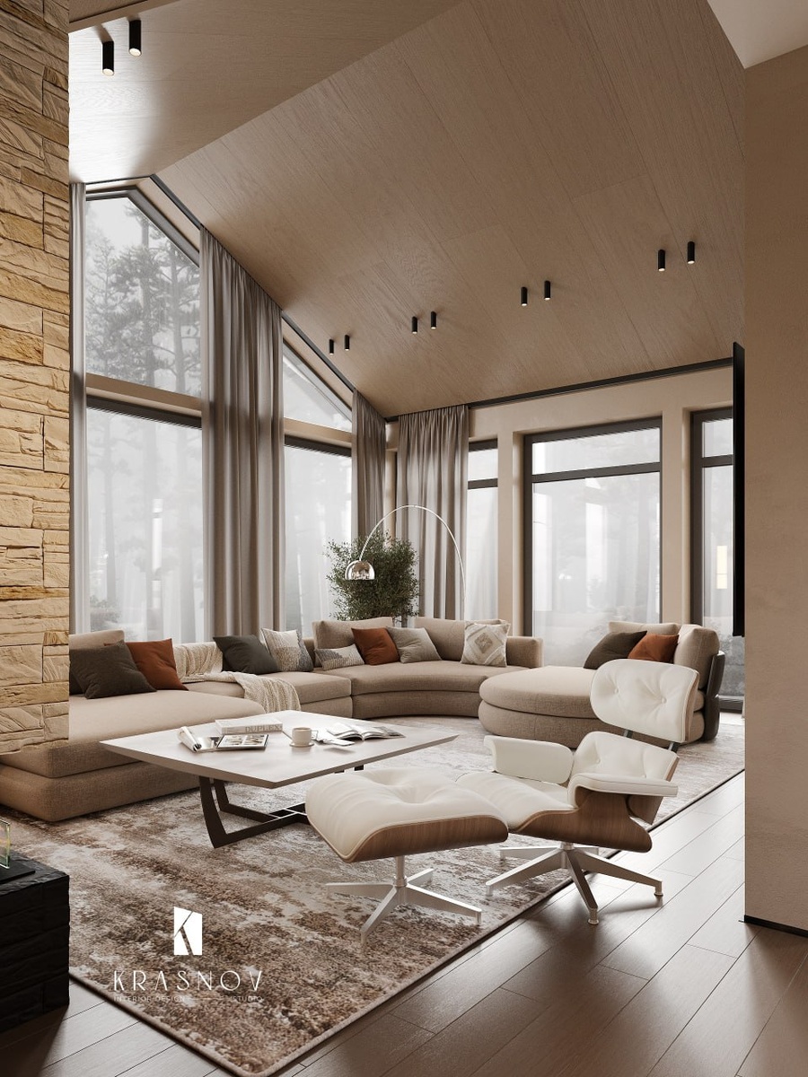 #KRASNOV_Тиммолово Друзья, сегодня покажу гостиную, где всё работает на ощущение масштаба и уюта одновременно. Мы оказались в доме с высоким двускатным потолком и панорамными окнами, и это само пространство задало настроение: воздух, свет и ощущение свободы. Наша задача была — подчеркнуть эту архитектуру, но при этом сделать гостиную не музейной, а по-настоящему живой и уютной. Ключевым элементом стал модульный диван. Он собран специально под масштаб комнаты: длинные секции формируют зону для большой компании, а закруглённый модуль добавляет пластики и мягкости. Это не просто мебель, а центр притяжения, где хочется проводить время с семьёй или друзьями. Чтобы объединить композицию, мы использовали ковёр. Он задаёт рамку зоне отдыха и работает как мягкий переход между мебелью и архитектурой. Здесь важен баланс: никаких кричащих акцентов, только тактильная глубина и спокойные переходы. Палитра строится на природных тонах: беж, песочный, молочный. Но мы добавили акценты — терракотов