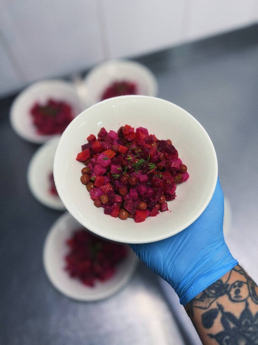1.Салат винегрет Ингредиенты: Свекла - 500 г Картофель - 300 г Морковь - 150 г Огурцы корнишоны по-французски - 200 г Горошек консервированный - 1 банка Растительное масло - 70 мл Соль морская - 6-7 г 2.Салат с крабовыми палочками и китайской капустой Ингредиенты: Крабовые палочки - 800 гр Помидор - 1 кг Болгарский перец - 450 гр Китайская капуста - 300 гр Майонез - 300 мл Чеснок 2-3 зубчика (20 гр) Соевый соус - 30 мл Пармезан - 100 гр 3.Салат из свежей капусты с хрустящими огурцом Ингредиенты: Капуста белокачанная - 750 гр Огурцы - 400 гр Морковь - 200 гр Уксус - 15 мл Растительно масло - 40 мл Соль - 10 Сахар - 25 Укропа - 10 гр 4.Салат Немецкий с запеченные картофелем бейби Ингредиенты: Грудка куриная 350 гр Горошек зелёный 1 банка Огурчики маринованные 250 гр Лук красный 70 гр Картофель запеченный 350 гр Растительное масло 40 мл Филе зелени 10 гр 5.Салат весенний Ингредиенты: Огурцы свежие 600 гр Китайская капуста 500 гр Редис 300 гр Болгарский перец 350 гр Сметана 250 м
