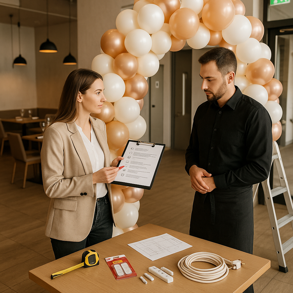Красивый декор — половина успеха события. Вторая половина — согласования. Ниже — удобный чек-лист вопросов администратору ресторана, чтобы в день Х всё прошло гладко: без «нельзя крепить», «нет розеток» и «через кухню проход запрещён».