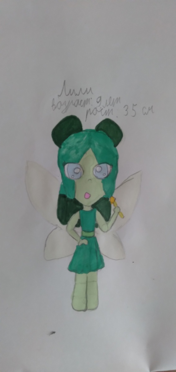 Знакомьтесь фея по имени Лили! Возраст: 9 лет Занятие: она любит читать книги, учить разные заклинания. Способности: умеет колдовать. Друзья: Арина(я), Снежинка, Аврора. Враги: нету. Описание: Волосы зелёных и тёмно-зелёных оттенков, глаза голубые, кожа светло-зелёная, крылья белые. Ник в рп: 💚Лили🌟.