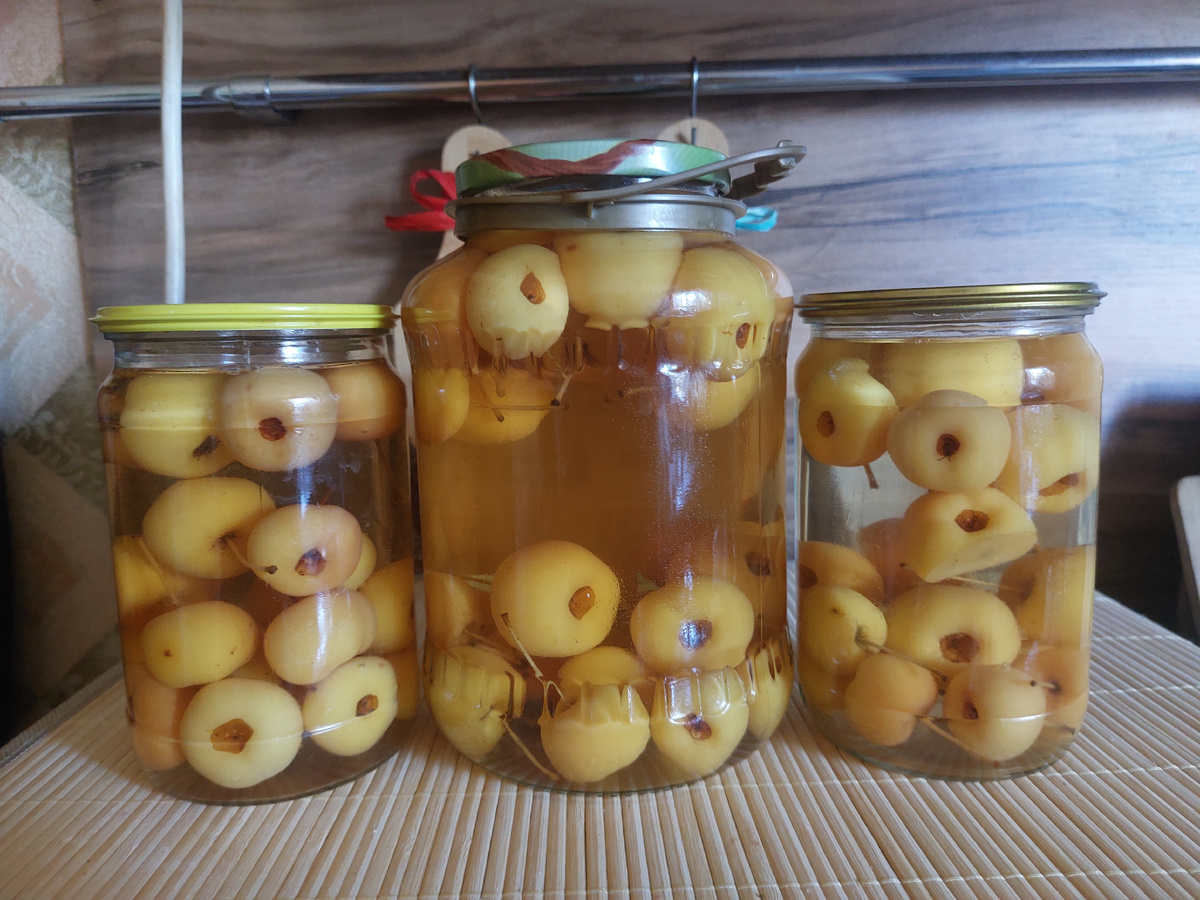 Я приготовила из них немного компота. Компот у нас любят. Я уже закрыла из черешни, и из винограда. И еще немного из малины. А теперь и маленькие яблочки попали в банку. Ну разве не хорошенькие?