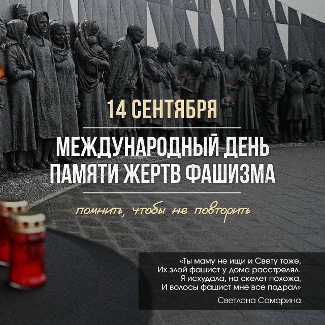 🌑День памяти жертв фашизма Каждое второе воскресенье сентября человечество чтит память невинных людей, ставших жертвами фашистского террора. Эта трагическая дата напоминает нам о страшных событиях, навсегда изменивших ход мировой истории. Не случайно этот памятный день находится между датами начала и окончания Второй мировой войны — конфликта, порожденного идеологией фашизма. Это была самая масштабная катастрофа XX века, затронувшая практически весь мир. Её последствия ощущаются до сих пор. Война принесла смерть и страдания не только солдатам на полях сражений, но и мирным жителям, оказавшимся в оккупации, узникам концлагерей, людям, пережившим блокаду и лишения. Этот день призван не только увековечить память погибших, но и предостеречь от повторения подобных трагедий. Фашизм, хоть и потерпел сокрушительное поражение, до сих пор пытается возродиться в современном мире, маскируясь под различные идеологии. Поэтому так важно сохранять единство в борьбе с любыми п Показать полностью...