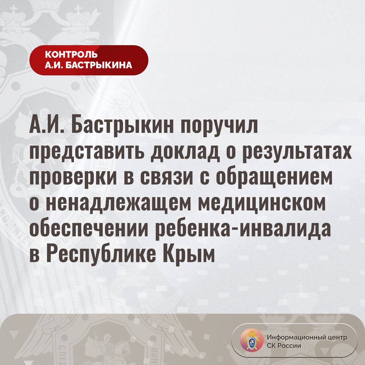А.И. Бастрыкин поручил представить доклад о результатах проверки в связи с обращением о ненадлежащем медицинском обеспечении ребенка-инвалида в Республике Крым В приемную Председателя СК России А.И. Бастрыкина «ВКонтакте» обратилась жительница Республики Крым по вопросу нарушения прав ее четырехлетнего сына, являющегося инвалидом, на качественное медицинское обеспечение. В текущем году мальчику выдаются некачественные медицинские приборы, в связи с чем их использование может негативно сказаться на состоянии здоровья ребенка. Отмечается, что в аналогичной ситуации оказались и другие дети-инвалиды, родители которых вынуждены приобретать исправные медицинские изделия другого производителя за свой счет. Обращения в профильные структуры результатов не принесли. В ГСУ СК России по Республике Крым и городу Севастополю по поступившему обращению организована процессуальная проверка. Председатель Следственного комитета Российской Федерации Александр Иванович Бастрыкин поручил руководителю ГСУ С