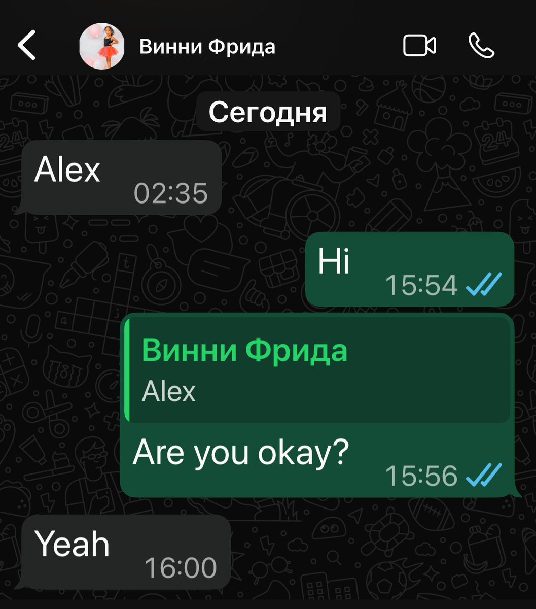 Часа в два ночи произошёл неприятный инцидент. Фрида покупала сигарету, я сидел, прислонившись спиной к ларьку, и что-то писал в «Телеграм». Вдруг подруга начала ругаться и отталкивать какого-то перепившего чебурека.