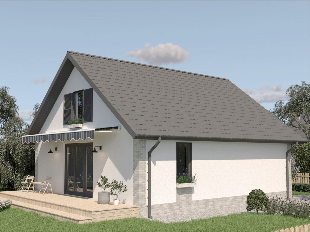 Дом выполнен в лаконичном архитектурном стиле: светлый фасад в сочетании с декоративной кирпичной отделкой и двускатной крышей придаёт ему аккуратный и уютный вид. Основные характеристики проекта: • Одноэтажный дом с возможностью организации жилой мансарды. • Просторная кухня-гостиная с выходом на участок. • Несколько спален, идеально подходящих для семьи с детьми. • Эргономичная планировка с продуманным зонированием: жилая и техническая части разделены. • Большие окна обеспечивают отличное естественное освещение. Почему газобетон? Благодаря материалу дом будет тёплым зимой и прохладным летом, а строительство пройдёт быстрее и экономичнее по сравнению с кирпичом.