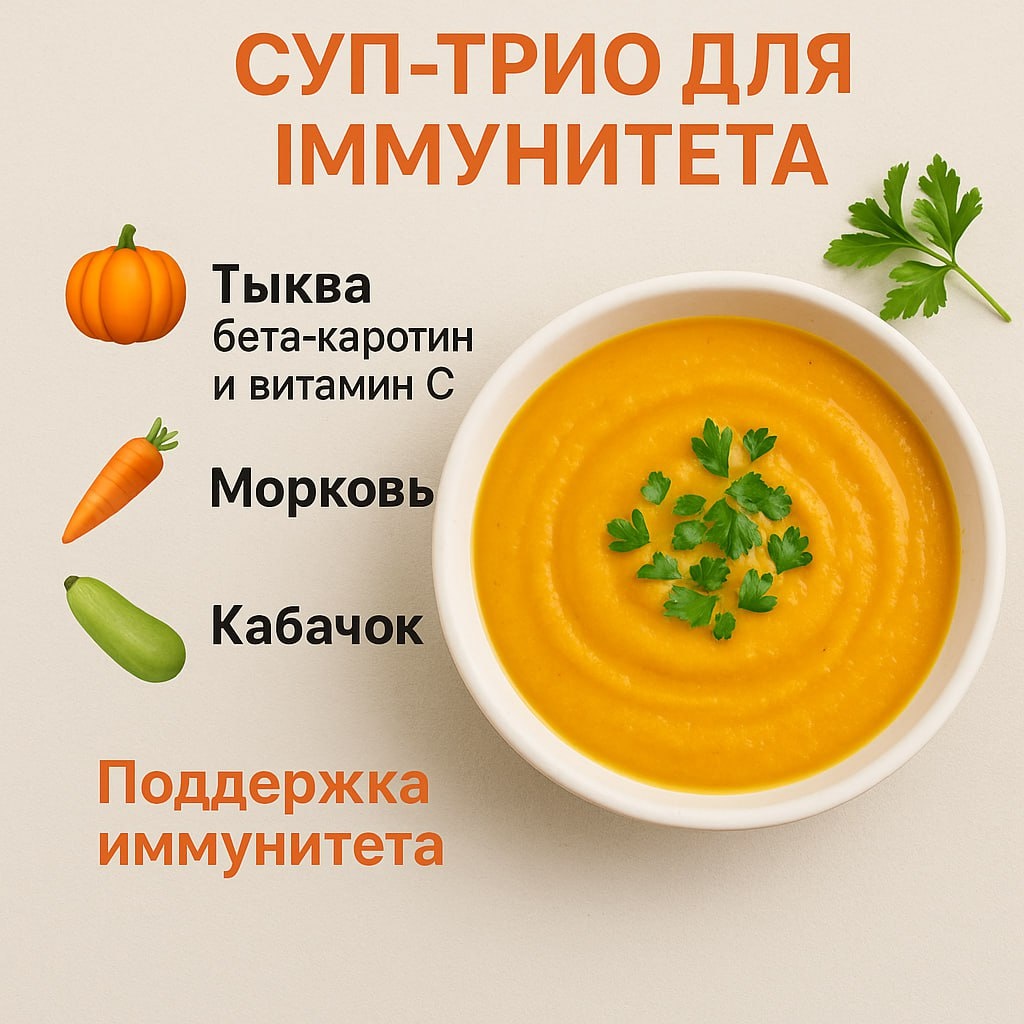 СУП-ТРИО ДЛЯ ИММУНИТЕТА 🧡 Тыква — бета-каротин, витамин C, пектины: поддерживают слизистые и помогают вывести токсины после вируса. 🥕 Морковь — главный источник каротина для иммунитета. 🥒 Кабачок добавляет клетчатку, «разбавляет» сахара и помогает пищеварению. Как готовлю (2 порции): 300 г тыквы, 150 г моркови, 150 г кабачка режу кубиком. В сотейнике прогреваю 1 ст. л. оливкового масла — так каротиноиды усваиваются лучше. Добавляю ½ ч. л. куркумы и ½ ч. л. имбиря (оба усиливают иммунитет). Заливаю 400 мл кипятка, тушу 20 мин, пюрирую. В отдельной чашке смешиваю половник супа и 1 ч. л. тахини, возвращаю в кастрюлю — суп становится кремовым, а вы получаете витамин E, кальций и полезные жиры. Перед подачей — посыпаю петрушкой. 3 ключа: 🧡 Каротиноиды и витамин С поддерживают защиту. 🧡 Пектины и клетчатка — мягкий детокс. 🧡 Тахини + масло помогают усвоению витаминов. Кто любит такие супы — делитесь своими лайфхаками 👇 #ЗдоровоеПитание_за3минуты #Восстановление_после_инфекций
