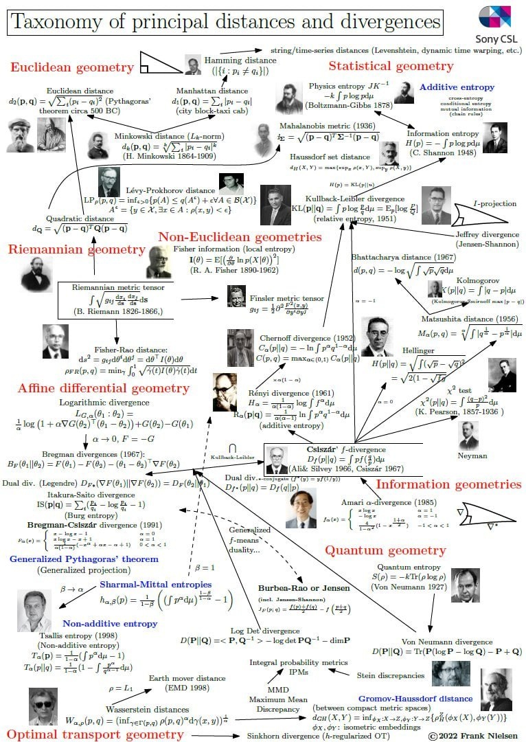 Очень крутой Плакат, посвящённый таксономии основных статистических расстояний и лежащим в их основе геометриям: евклидовой геометрии, римановой и финслеровой геометрии, информационной геометрии, аффинной дифференциальной геометрии, квантовой геометрии и т. д.