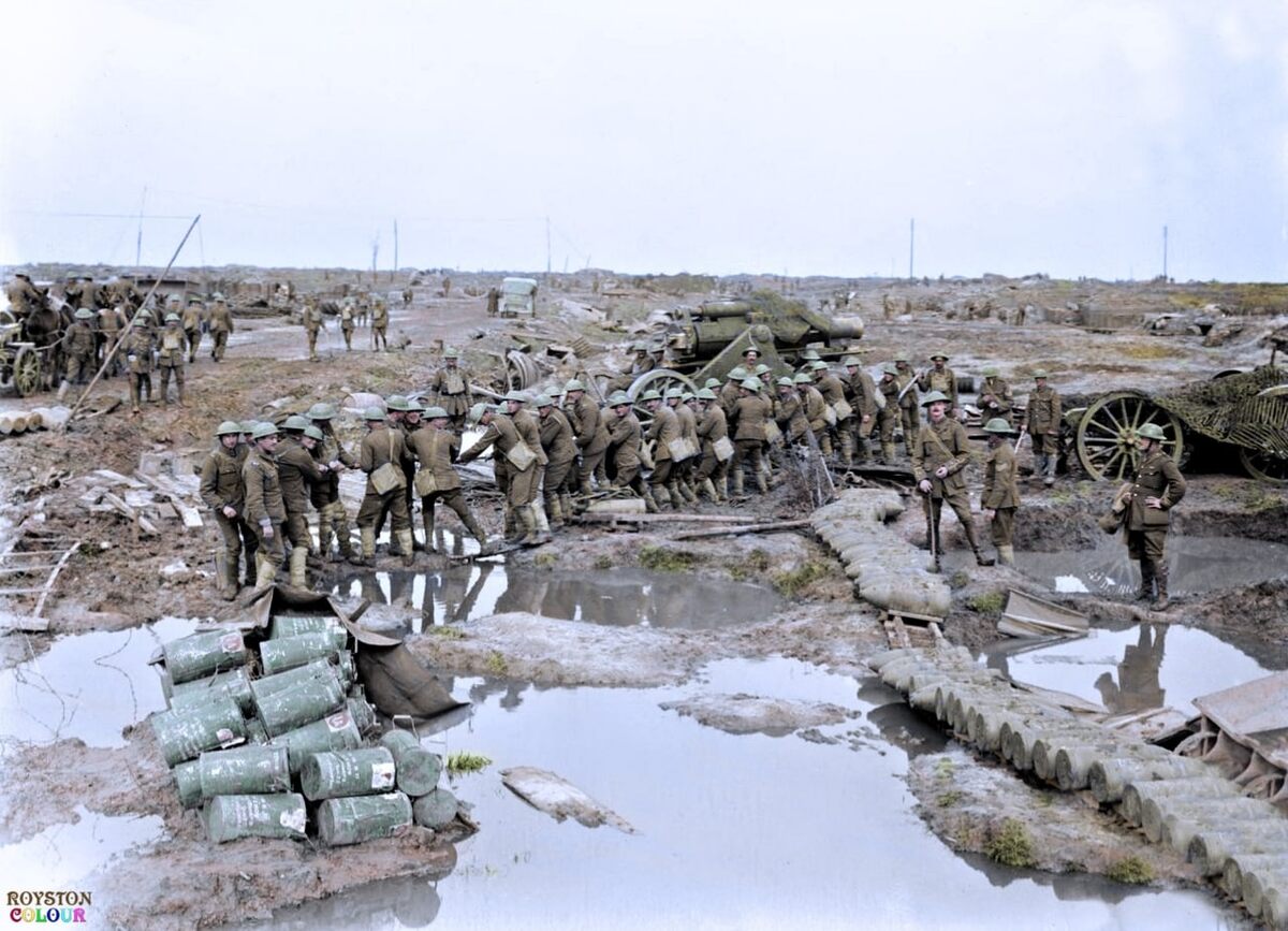 Солдаты британской королевской гарнизонной артиллерии, переносят 9.2-дюймовую гаубицу недалеко от Ипра, 14 сентября 1917 года