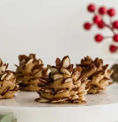 По данному простому рецепту получается четыре сосновые шишки. Сосновые шишки полностью съедобны, и их можно есть как самостоятельный мини-десерт или закуску. Такими шишками можно украсить новогодний торт или полено. Готовятся несложно. Вот рецепт миндальных шишек. Для приготовления нам будут нужны вот эти продукты: