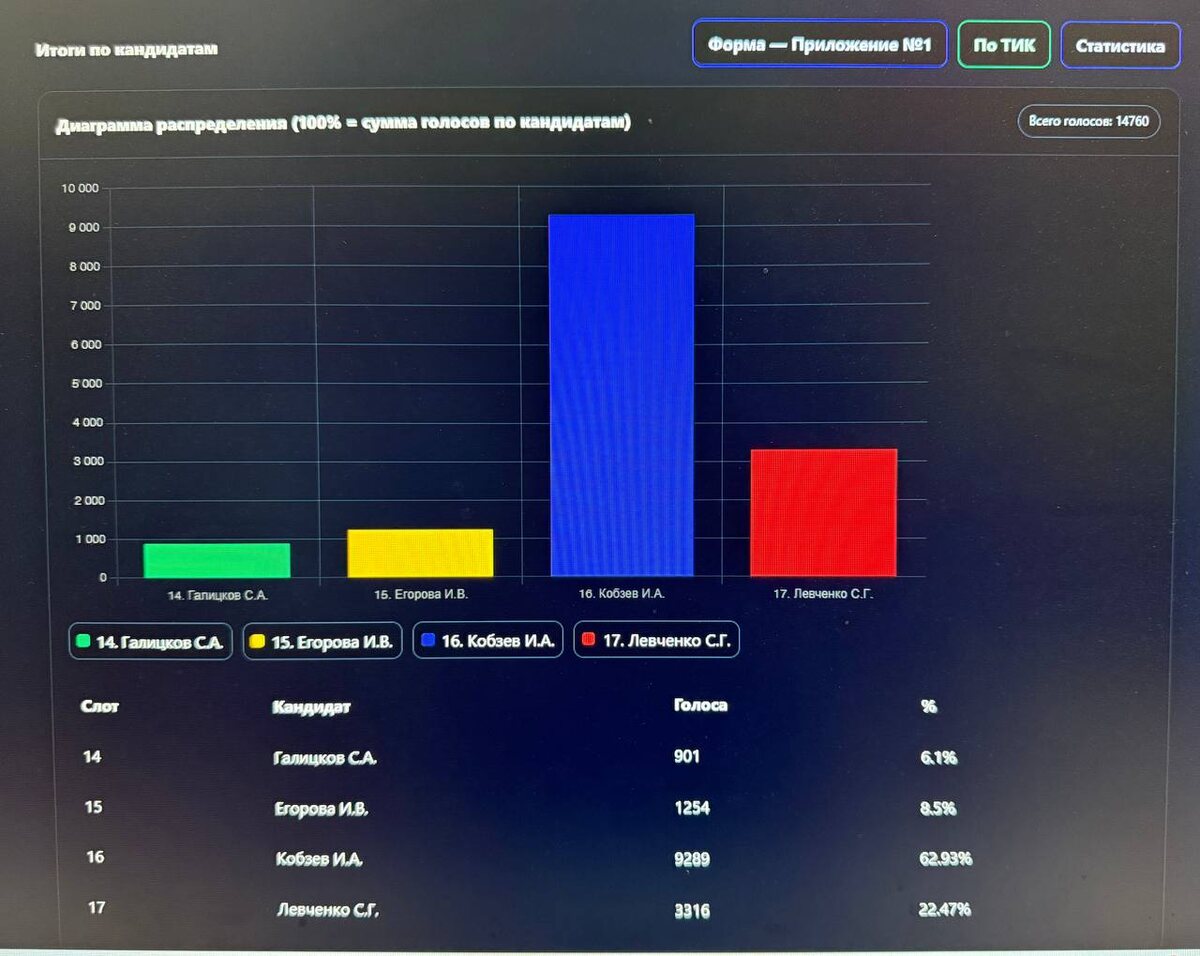 Кобзев набирает около 62% на выборах губернатора Иркутской области — данные КПРФ Депутат Госдумы РФ, кандидат в губернаторы Иркутской области Сергей Левченко (КПРФ) опубликовал предварительные итоги выборов главы Приангарья после подсчёта около 14 тыс. бюллетеней. Действующий губернатор Игорь Кобзев («Единая Россия») получает 62,93%, Левченко – 22,47%. Эти результаты серьёзно отличаются от тех, которые объявили госагентства со ссылкой на ЦИК, написав, что Кобзев получает около 80% после обработки около одного процента протоколов. Экзитполы, объявленные в эфире местного «Центра общественного наблюдения» при участии Кобзева, показали 71,5% у единоросса и 19% у коммуниста. На сайте ГАС «Выборы» пока нет никаких данных. На одном из участков в Куйтуне Левченко опередил Кобзева. (фото @tovarish_levchenko и @bg_irkutsk) Подписаться| Прислать новость| Помочь бустами