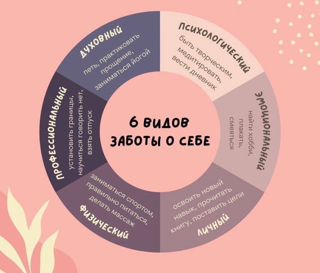 Забота о себе — это не роскошь, а необходимость! 🧘♀ Помните, что забота о себе бывает разной: Духовная: медитация, йога, прощение. Профессиональная: установление границ, умение говорить «нет». Физическая: спорт, правильное питание, массаж. Психологическая: творчество, ведение дневника. Личная: обучение новому, постановка целей. Эмоциональная: хобби, смех, слёзы. Найдите свой способ заботы о себе и начните прямо сегодня! ❤️