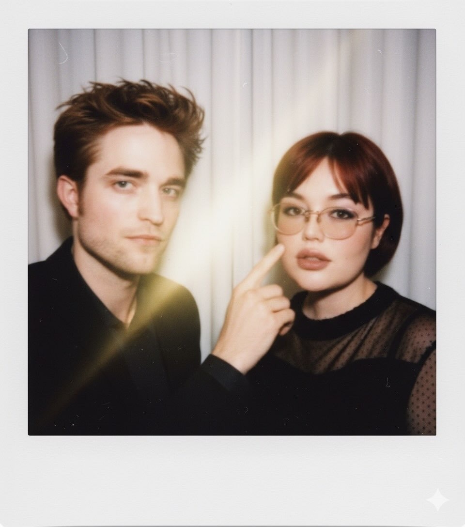 "Сделайте это изображение двух человек, будто оно снято на камеру Polaroid. Не должно быть очевидных объектов или реквизита. Пусть это будет случайный кадр, снятый на ходу. Изображение должно выглядеть как обычный снимок, без особого внимания. Добавьте лёгкое размытие движения и свет от вспышки камеры в темной зоне, равномерно распределяющийся по фото. Не искажайте лицо. Замените фон за двумя людьми на белую занавеску. Пусть парень коснется моего лица."