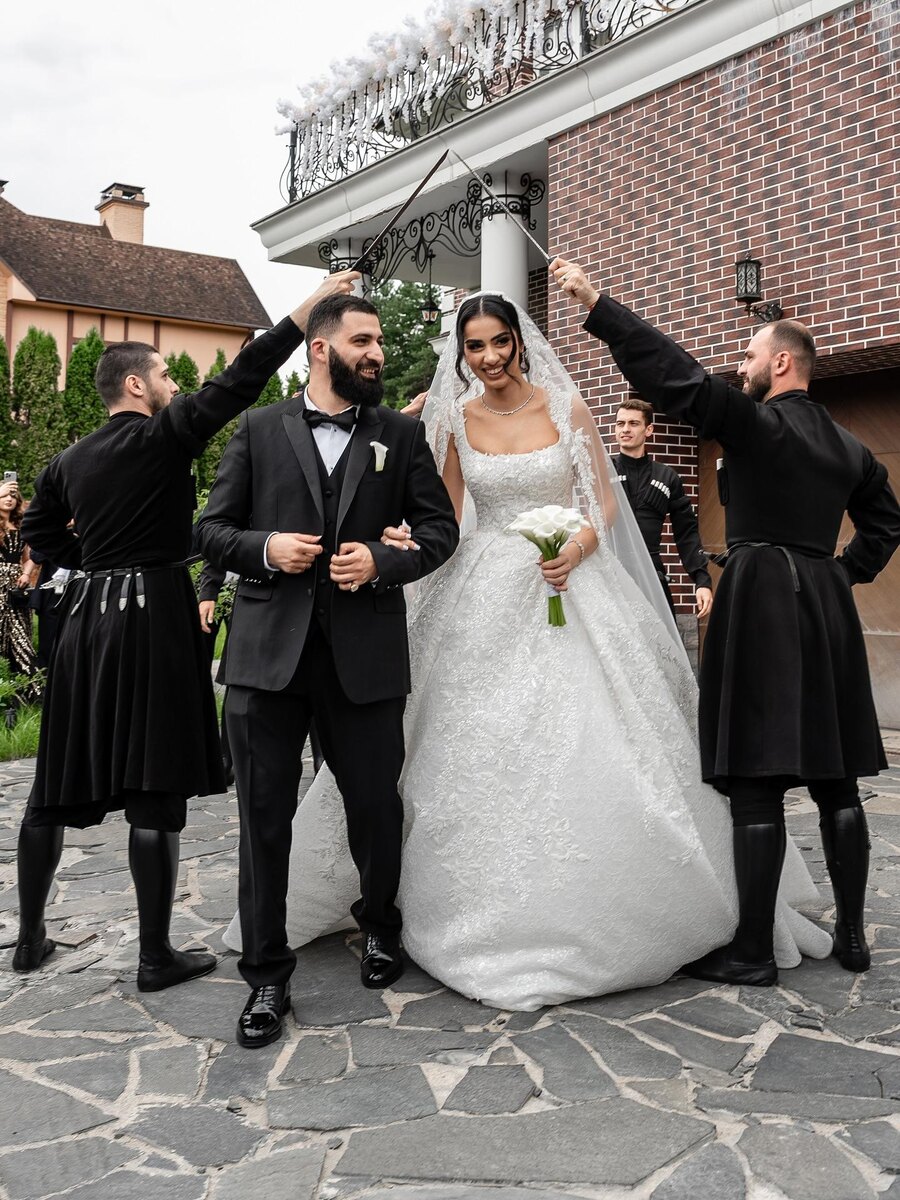 Для свадьбы невеста выбрала белое пышное платье и фату с длинным шлейфом, а для букета невесты предпочла белые каллы. Эка за время праздника сменила несколько платьев.