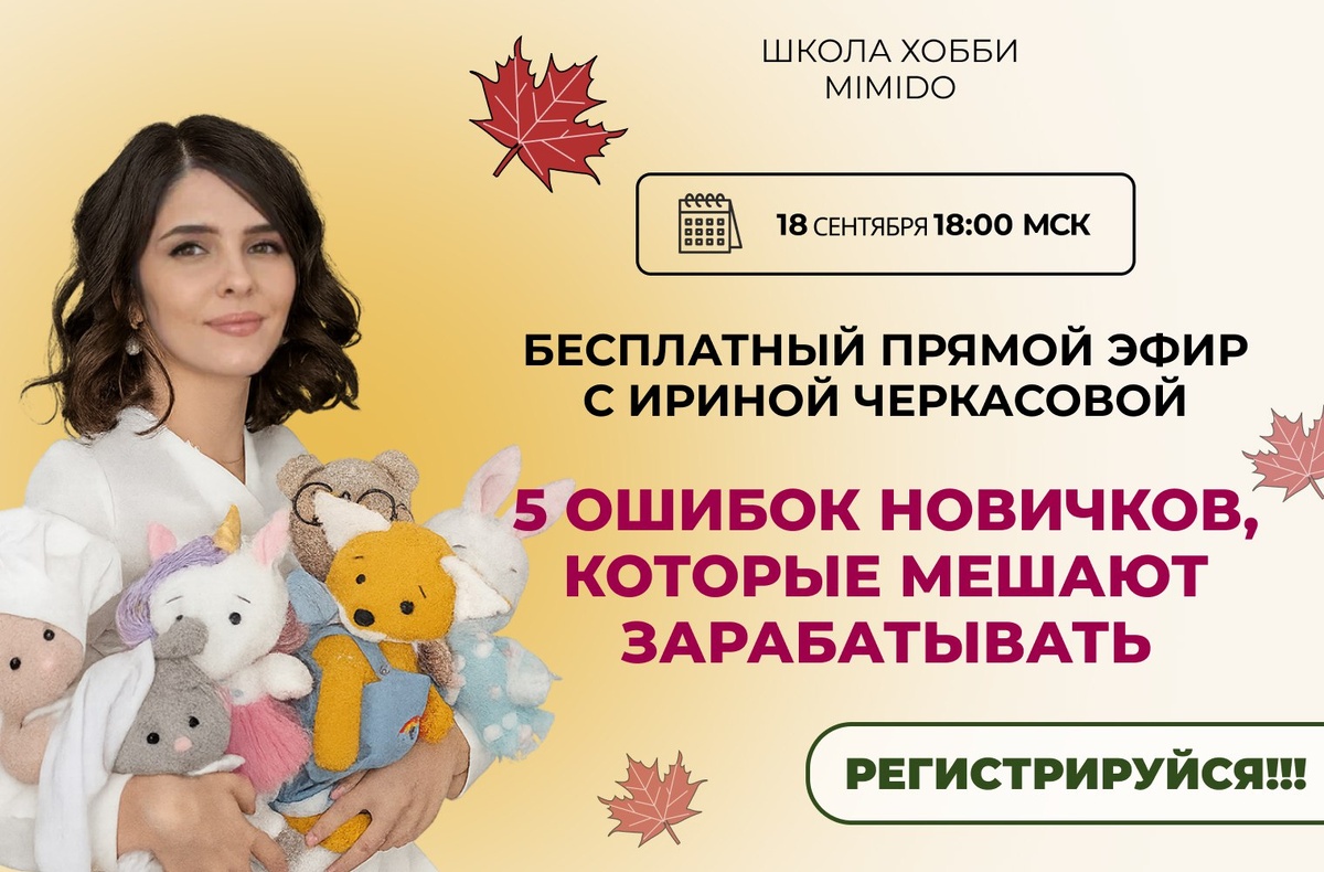 🌿 Хочется зарабатывать на любимом хобби — но как начать? Наверное, вы это чувствовали: - шьёте игрушки с любовью, вкладываете душу — а дальше не знаете, как продвигаться - кажется, что всё красиво, но «кому это надо» - и очень хочется, чтобы кто-то показал путь — по-человечески, без «успешного успеха» Я приглашаю вас на "вечерние посиделки" 18 сентября, где мы спокойно, без суеты поговорим о важном. Тема эфира: 5 ошибок новичков в рукоделии, которые мешают зарабатывать. 🧵 Я расскажу: — почему не получается продать, даже если игрушка красивая — какие страхи мешают выйти на новый уровень — как обойти «подводные камни» и не потерять вдохновение 🧡 Кстати, среди участников эфира я разыграю одну из стипендий! Не пропустите! 🎁 Подарки: - инструкция по установлению цены - сразу после регистрации на эфир + БОНУС на эфире, но пока - Тсс🤫 ❗ Доступ к эфиру - только через запись! Чтобы мы могли организовать выдачу бонусов без сбоев Зарегистрироваться на эфир⬇ https://mimido.su/retgk