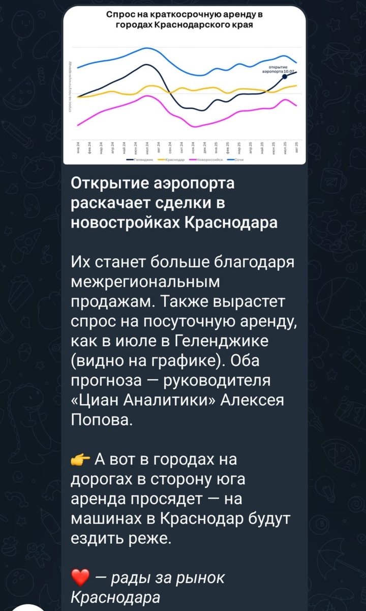 Такое ощущение что построили этот аэропорт, а не открыли. В разных профильных каналах по недвижке новость об открытии аэропорта подаётся так, как будто это событие вселенского масштаба. До аэропорта Сочи 4 часа на ласточке, до минвод 5. Никакой проблемы летать не было, все прекрасно летают. Некоторые поездом напрямую вспоминают детство. Катастрофы не произошло с закрытием аэропорта, не произойдёт бума продаж и с открытием. Вообше что за дебилизм думать что тебя заставит принять решение о покупке квартиры удобство разового прилёта на сделку или что? Аэропорт тут был, есть и будет, что изменилось в параметрах приобретаемой недвижимости? Так бомбит у меня от этой тупости, просто сил нет. "станет больше благодаря межрегиональным продажам" - может межконтинентальным, или космодром построить и межпланетным. Лишь бы никому не нужные метры по семейке продать марсианам детьми. Я бы от греха подальше ни Геленджик не открывал ни Краснодар. У нас мобильный интернет глушат каждую ночь, беспило