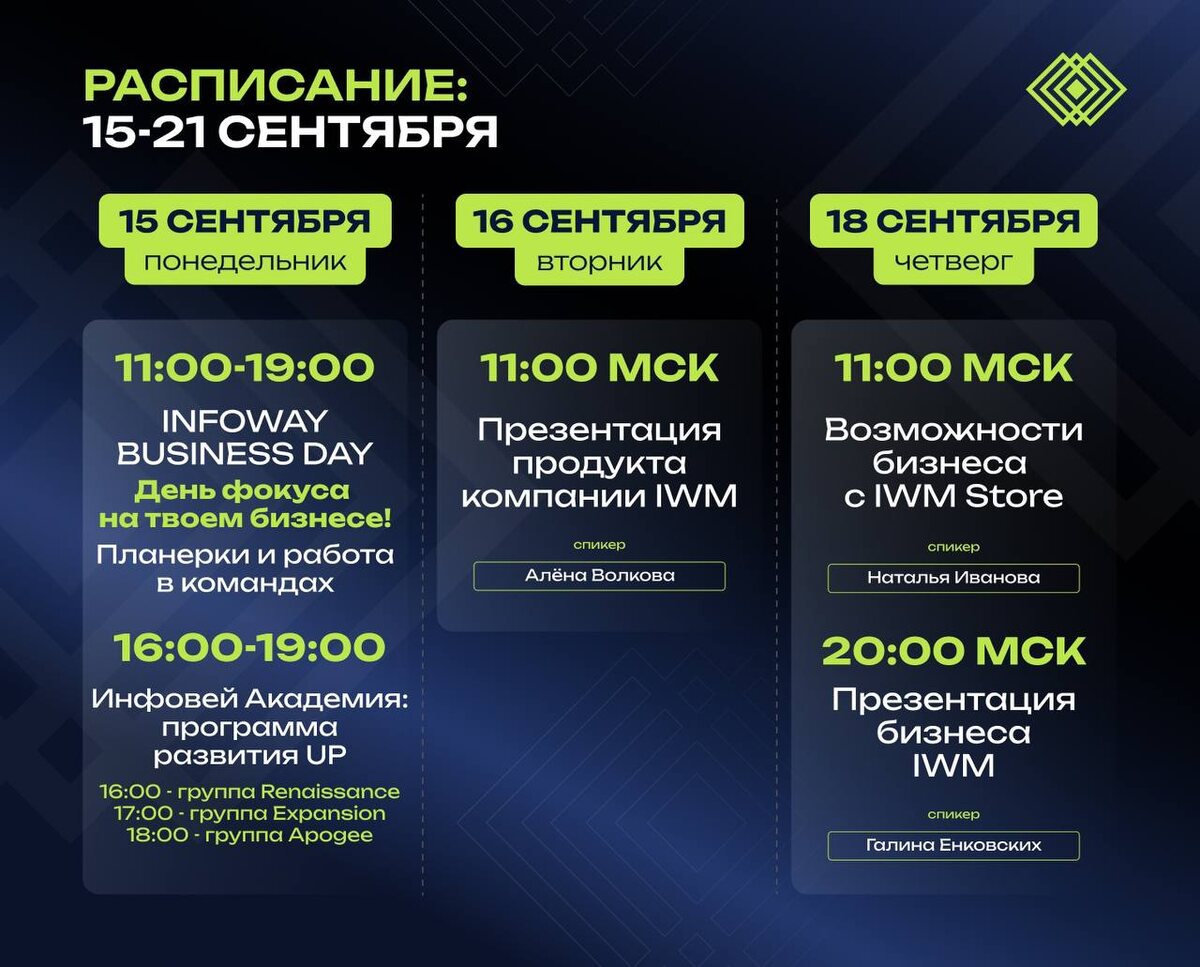 Расписание на неделю 🗓 15-21 СЕНТЯБРЯ⚡️ Не пропустите Business Day и экспертную прокачку!☕️ Ваш график мощной прокачки от IWM на эту неделю, где каждая минута работает на ваш результат! Забудьте о хаосе и бессистемных действиях! Что вас ждет? Стратегические сессии, мощный командный мозговой штурм, инсайты, которые изменят ваше видение бизнеса. Ваша задача? Работать! Каждое действие должно приводить к конкретному результату. Перенимайте опыт тех, кто уже достиг успеха, и избегайте типичных ошибок. Перестаньте просто планировать! Начните ДЕЛАТЬ! Прямо сейчас добавьте эти мероприятия в свой личный календарь. Включите уведомления, чтобы не пропустить важную информацию.