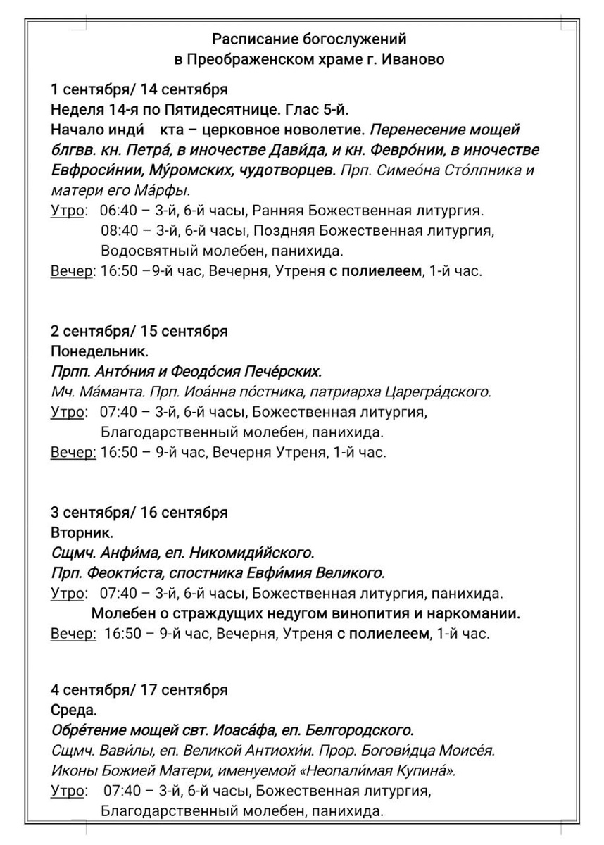 14-21.09. Расписание богослужений в Преображенском храме г. Иваново