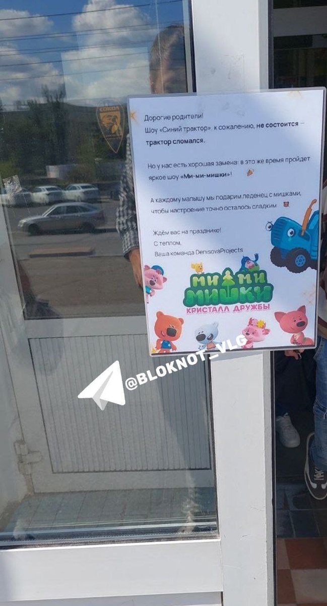 Редакция «Блокнота» связалась с организаторами шоу, в качестве которых указана DenisovaProjects. Там сообщили, что «Синий трактор» отменили по техническим причинам и пришлось заменить спектакль. Зрителей уведомили об этом за несколько дней в рассылке и социальных сетях. Тем, кто не смог прийти или отказался смотреть на «Ми-ми-мишек», пообещали вернуть деньги.