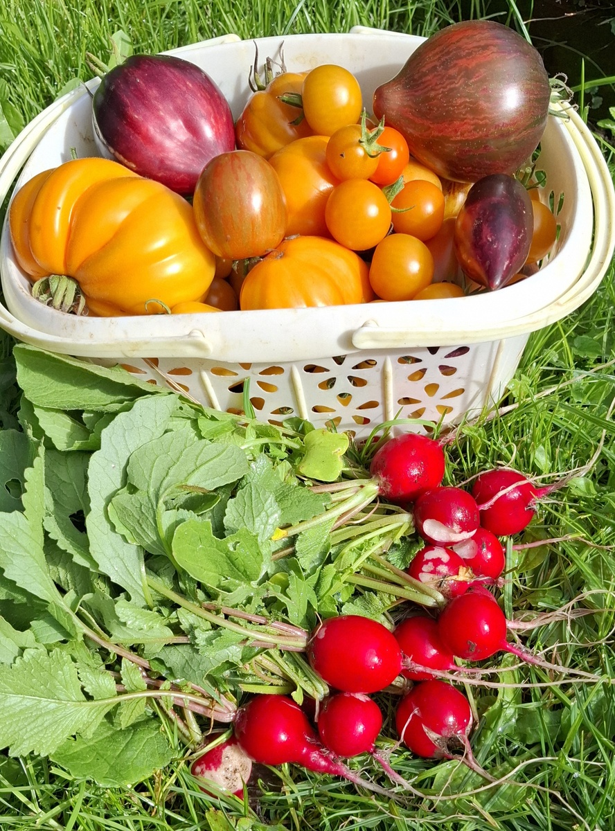 Погода пока стоит сухая и солнечная. Жары нет, воздух остывает, но на солнце очень приятно. Помидоры по-немногу продолжают спеть, черрики отлично завязываются до сих пор, на крупноплодных доспевают верхние кисти. Редиска хорошо спеет, сочная, сладкая - это оценили и какие-нибудь полёвки, часть урожая погрызена.. Вот черри, ии вообще всё равно на сентябрь, отсутствие полива, кладоспориоз... Кейл перед теплицей растёт - не могу налюбоваться! Такие шикарные листья! На лавочке выросла вот такая живописная композиция И днём встретили товарища который живёт в теплице, видимо, вышел подкрепиться. И наше окно, красиво заросло девичьим виноградом снаружи и мне очень нравится сухой букет внутри...