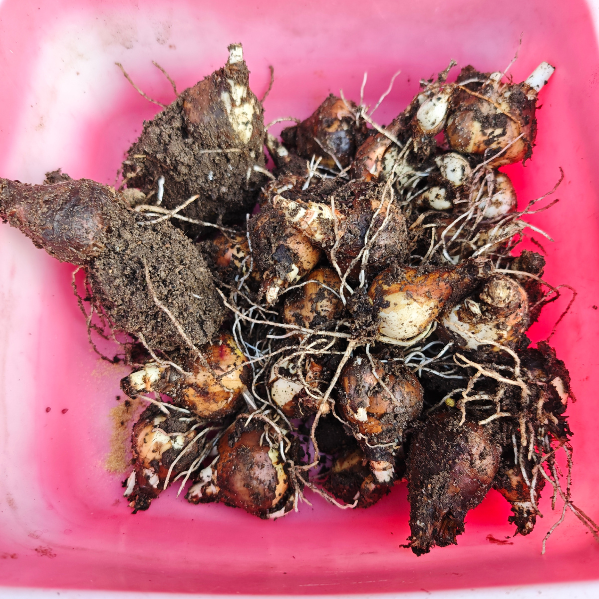 Руки чесались... Начало эксперимента здесь: Решила, что не надо мне столько горшков с нарциссами, тем более не особо душистыми, и выпотрошила половину. Если честно, думала, что там всё сгнило, т.к. они почти все лето стояли под открытым небом и щедро поливались дождем. По одному горшку каждого из трех сортов я вытряхнула еще в июле - проверить состояние и сохранить луковицы на случай гибели всех остальных. Там все было печально, земля чавкала. Отлично выглядел Эрличер, а два крупнокорончатых сорта подгнили. Ну что-то набралось на сохранение, и ладно, я махнула рукой - не до них, убрала горшки под стол. Теперь решила посадить сохраненышей вдоль края парадной клумбы, которая с "головой червяка", и думаю - чет мало!😁 Достала горшки из под стола ) А там красота: земля худо-бедно подсохла, из четырех горшков всего три гнилых луковицы. При посадке они почти все были двойными - сейчас детки укрупнились и отсоединились от мам. Если при летней выемке корни были старыми, то сейчас явно новые, б