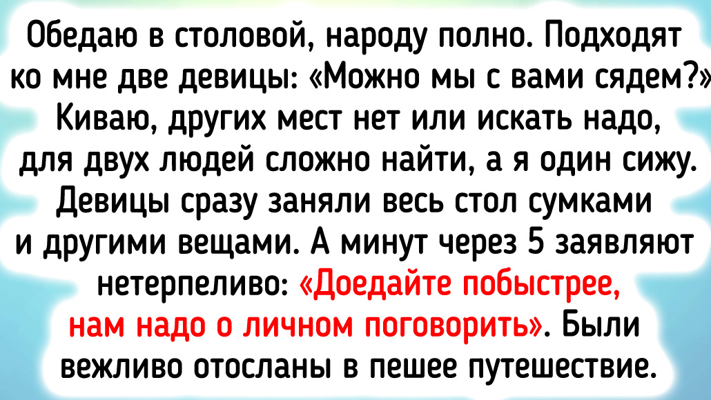 Обедаю как-то в столовой, народу полно. Подходят ко мне две девицы: «Можно мы с вами сядем?» Киваю, других мест нет или искать надо, для двух людей сложно найти, а я один сижу. Девицы сразу заняли все свободное пространство стола сумками и другими вещами. А минут через 5 нетерпеливо заявляют: «Доедайте побыстрее, нам надо о личном поговорить». Были вежливо отосланы в пешее путешествие. © rokwan / Pikabu