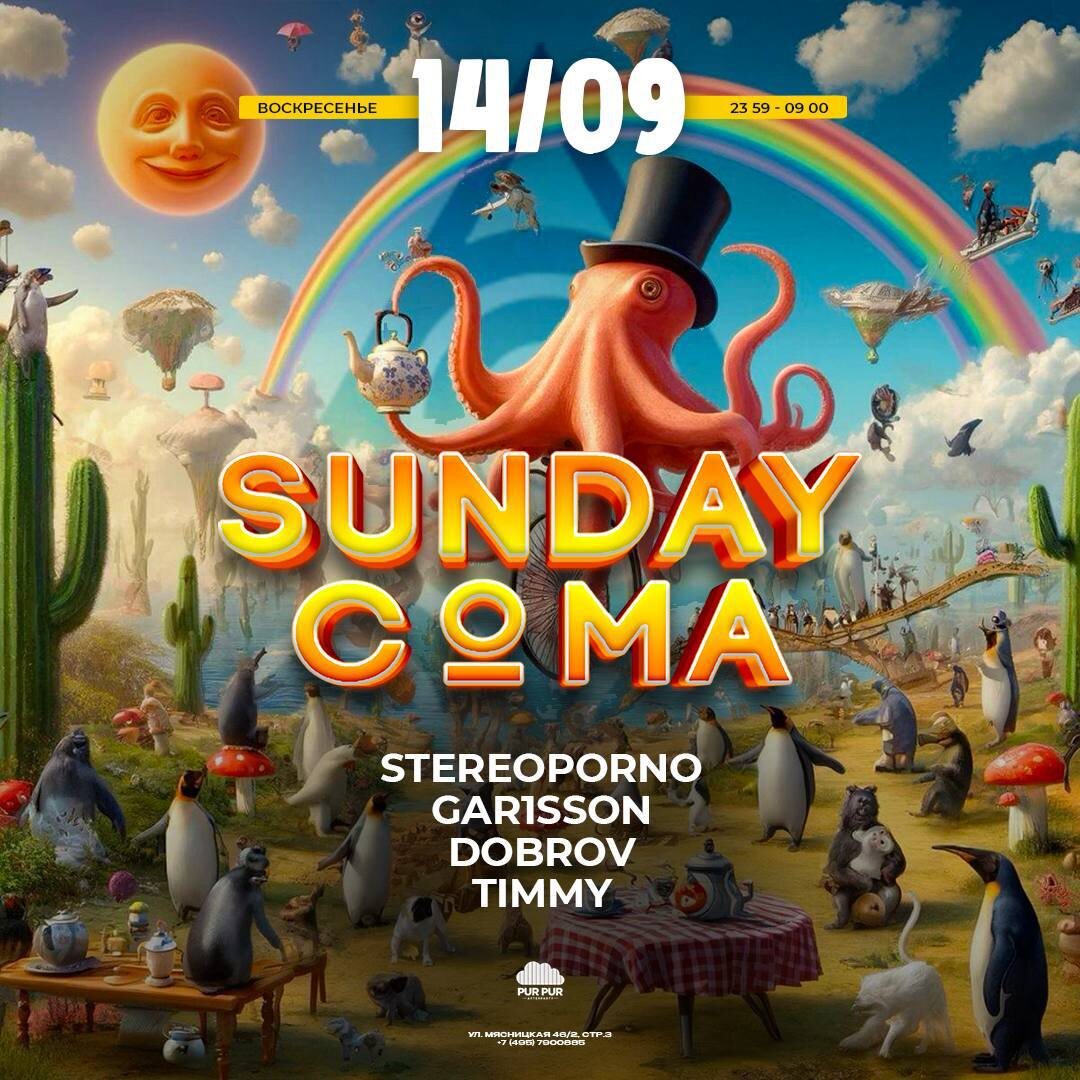 ▲ 14/09 - SUNDAY COMA Наверняка, вы сильно удивитесь, если мы сообщим, что до Нового Года осталось чуть больше ста дней! А пока нам тепло и солнечно - и это отличный повод выбраться на тусовку! И какая разница, какой день недели, если лайн-ап максимально горяч?! 🔞 STEREOPORNO ♨️ GAR1SSON 🆘 DOBROV 🚫 TIMMY ТГ канал @SundayMusicComa 🎫 Вход свободный Info & Reserve: +74957900885 FC / DC 📆 14 сентября, 23:59—9:00 📍PUR PUR iBAR , Москва, Ул. Мясницкая 46/2стр3