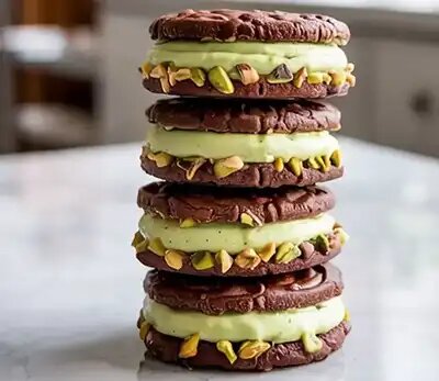 Это фисташково-шоколадное печенье-сэндвич представляет собой сочетание мягкого шоколадного печенья, похожего на брауни, с нежным ярким фисташковым сливочным кремом. Каждое печенье обвалено в измельчённых фисташках, чтобы придать ему хрусткость и усилить фисташковый вкус. Они эффектно смотрятся на десертном подносе и станут продуманным праздничным угощением для особых случаев.
