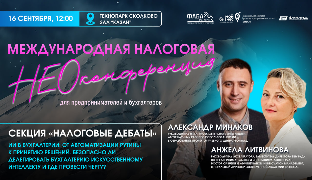 Друзья, уже в этот вторник, 16 сентября в 12:00 выступаю на дебатах в Сколково. Поговорим про применение ИИ в бухгалтерии и не только! 👍Мероприятие будет состоять из трех секций: дебаты, налоговый баттл, иммерсивная секция. Будет полезно для предпринимателей и бухгалтеров. ✔️ Узнать подробнее и зарегистрироваться можно по ссылке: 👉 https://faba-platinum.ru/neoconf?utm_source=minakov
