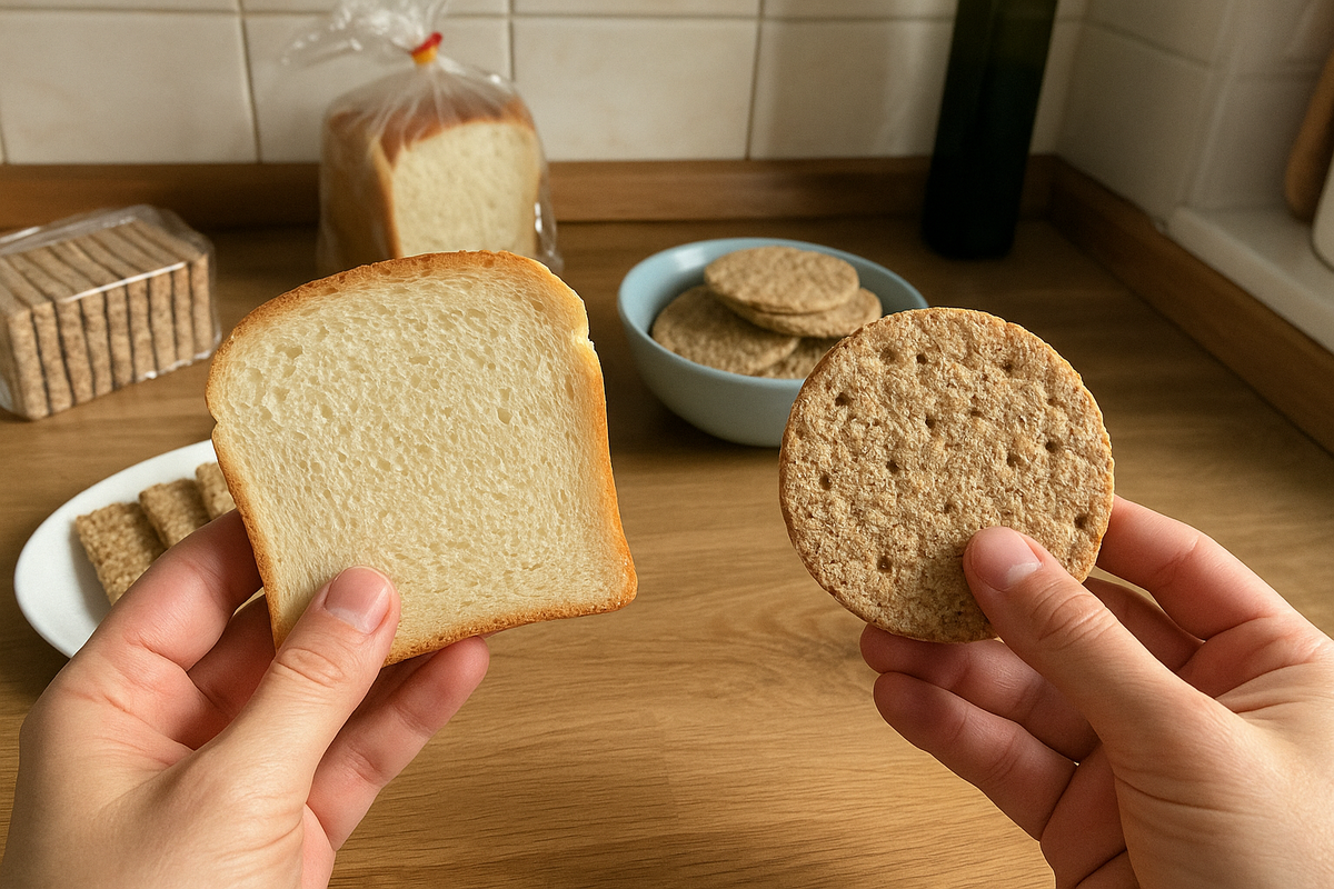 Честно скажу: когда я только начала разбираться в питании, мне казалось, что хлебцы — это прям «святая диета в квадрате». Мол, белый хлеб = зло, а хрустящие хлебцы = залог похудения. Думаю, у тебя тоже была такая мысль :) Но когда я копнула глубже, оказалось, что всё не так очевидно. 💡Прежде чем начнём, маленькая подсказка: я сама часто использую бота FoodlyMe - https://t.me/wordsyrus_bot, чтобы быстро прикинуть калорийность — просто сфоткал или продиктовал, и сразу видишь цифры БЖУ. Очень выручает, особенно когда сравниваешь продукты вроде хлеба и хлебцев. Смотри, если брать цифры на 100 грамм: Опа, сюрприз: хлебцы даже калорийнее! Но тут важный нюанс — вес порции. То есть в реальной жизни ты за раз съешь меньше калорий, если возьмёшь хлебцы. Если гнаться только за калориями — почти одинаково. Но вот состав и то, как продукты влияют на организм, тут хлебцы реально выигрывают. Почему: Тут работает сразу несколько факторов дорогие :) Если цель — похудеть или держать аппетит под контро