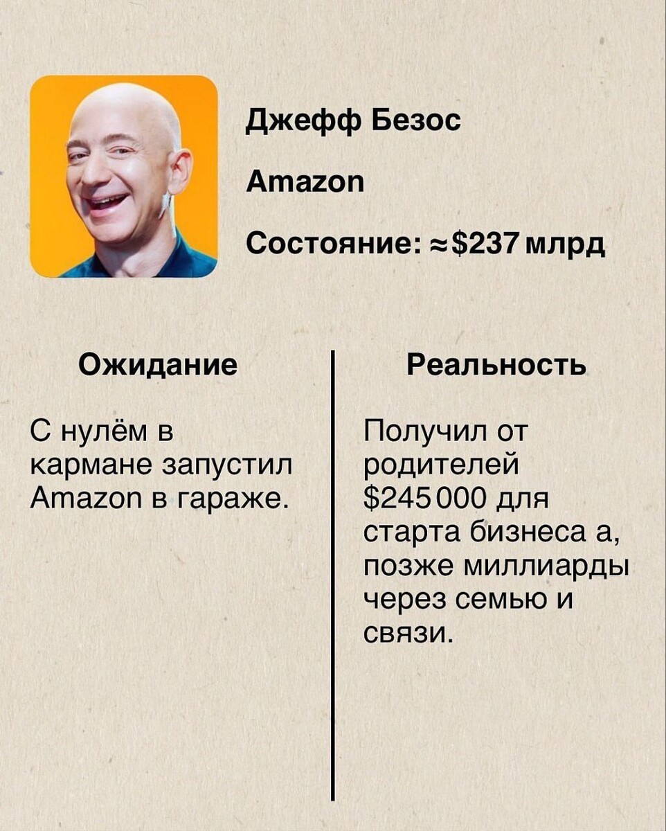Сказки про "сам сделал с нуля" и факты. Ожидание и реальность :) См. картинку. Что я думаю - ваши усилии сделать бизнес "с чистого листа" похвальны, но поверьте, что шансов гораздо больше, если у вас будет некое подспорье (связи, деньги и т.п.). По этой причине, большие компании всегда будут иметь фору в начинаниях, перед мелкими и нищими стартаперами. Ну и когда вы слышите, в очередной раз, как нищей стартапер построил успешный крупный бизнес, стоит включить критическое мышление :) Русский ИТ бизнес