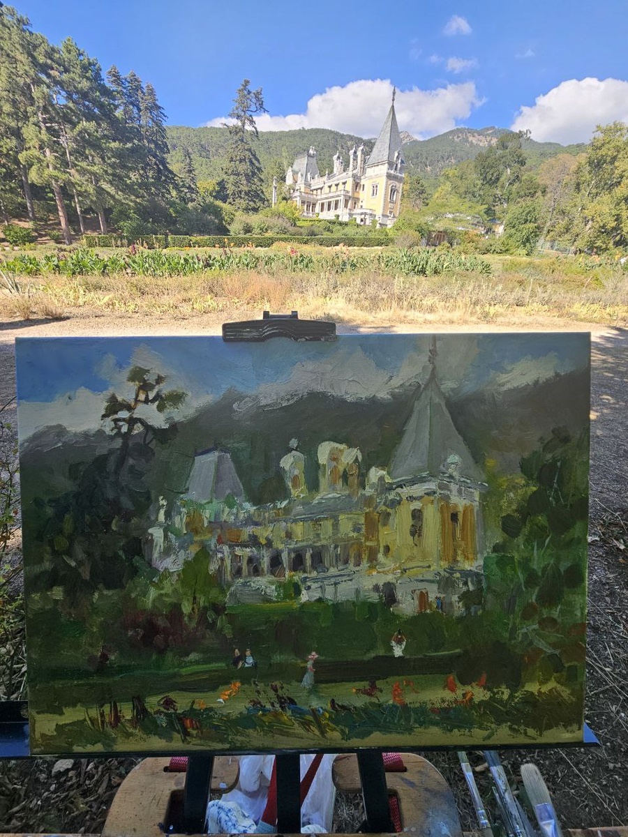 Это удивительное место с потрясающими пейзажами. Я побывала здесь на пленэре. При входе мне сообщили, что для свободного творчества нужно заполнить заявление, заметив у меня триногу. Я написала его вручную в маленьком желтом здании, которое находится за дворцом, и меня допустили к пленэру. Работать было сложно из-за сильного ветра и постоянно меняющегося света на холсте, но это был ценный опыт, и я осталась довольна. #пленэр #масло@ksupolzikova_art