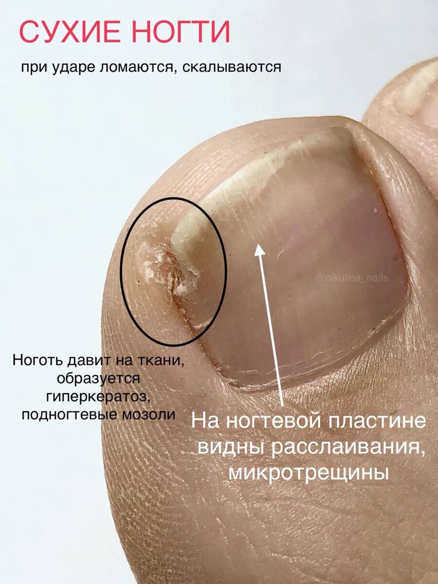 Некачественно выполненный маникюр или педикюр (например, использование пилки с крупной абразивной крошкой).