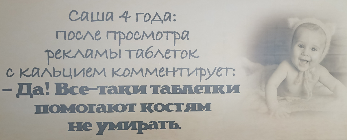 Несколько раз заезжал в придорожное кафе недалеко от города Обнинска. Некогда это кафе было очень востребовано: вкусно кормили, хорошее обслуживание, "чистота и порядок кругом". Сегодня кафе доживает последние дни всвязи с реконструкцией дороги. Это сразу чувствуется по ассортименту предлагаемых угощений, по содержанию зала. Поэтому, заехал в последний раз. А чтобы оставить память, снял детские высказывания, которые размещены на стене этого, некогда уютного заведения. Итак, читаем и улыбаемся! Спасибо за прочтение! Пишите комментарии, высказывания своих детей. Эта тема неиссякаема и, по-моему, интересная.