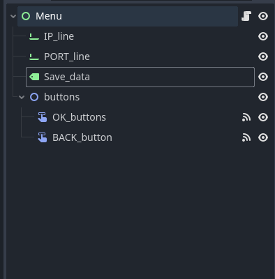 Продолжаю небольшой цикл с рассказом о том, как я делал из своего телефона геймпад, чтобы просто поиграть с друзьями в Broforce на ноутбуке. Сегодня поговорим о переключениях между сценами, чтению и записи в json-объект, и передачу данных по сети. После первой + 1.5 статей у нас есть сцена с кнопками. Её мы назначим главной, чтобы при запуске приложения она нас сразу встречала. Теперь создадим сцену с настройками. В этот раз это будет узел Control, вместо Node2D, потому что в Control входят так нужные нам строки с записью текста. Зависимости такие: Получить данные, которые пользователь будет писать в строках IP_line и PORT_line довольно просто, буквально две строки. Создадим функцию для обработки события нажатия OK_buttons. Можете сделать это быстро нажав на кнопку->узел->двойное нажатие по событию pressed() (нажата) Программа попросит выбрать к кому будет привязана кнопка - выбираем скрипт нашего "меню". data - наш Json объект. Json в целом очень удобный формат хранения данных, предс