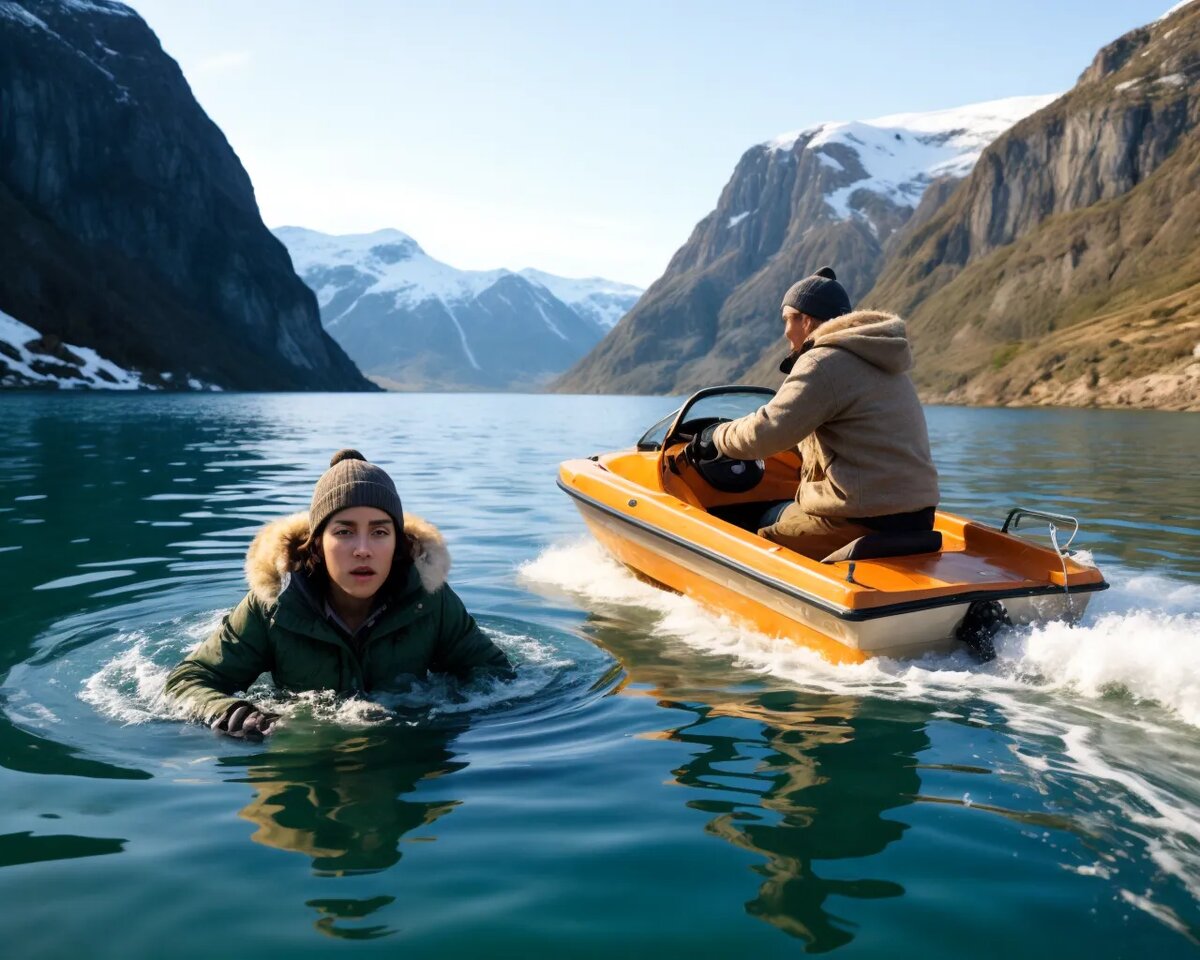 Паника взорвалась в груди женщины слепым, животным ужасом. Она видела удаляющийся белый корпус катера, тёмный силуэт мужчины у штурвала. «Одвар!» – её крик был тонким, почти птичьим, и казался жалким и неуместным в этом величественном, молчаливом мире скал и воды. Доктор махала руками, пытаясь удержаться на плаву, но её движения были хаотичными, бесполезными. Шерстяной свитер, который ещё недавно казался таким уютным, мгновенно намок и теперь тянул вниз с неумолимостью свинцового груза. Пальцы быстро теряли чувствительность, превращаясь в непослушные ледышки.