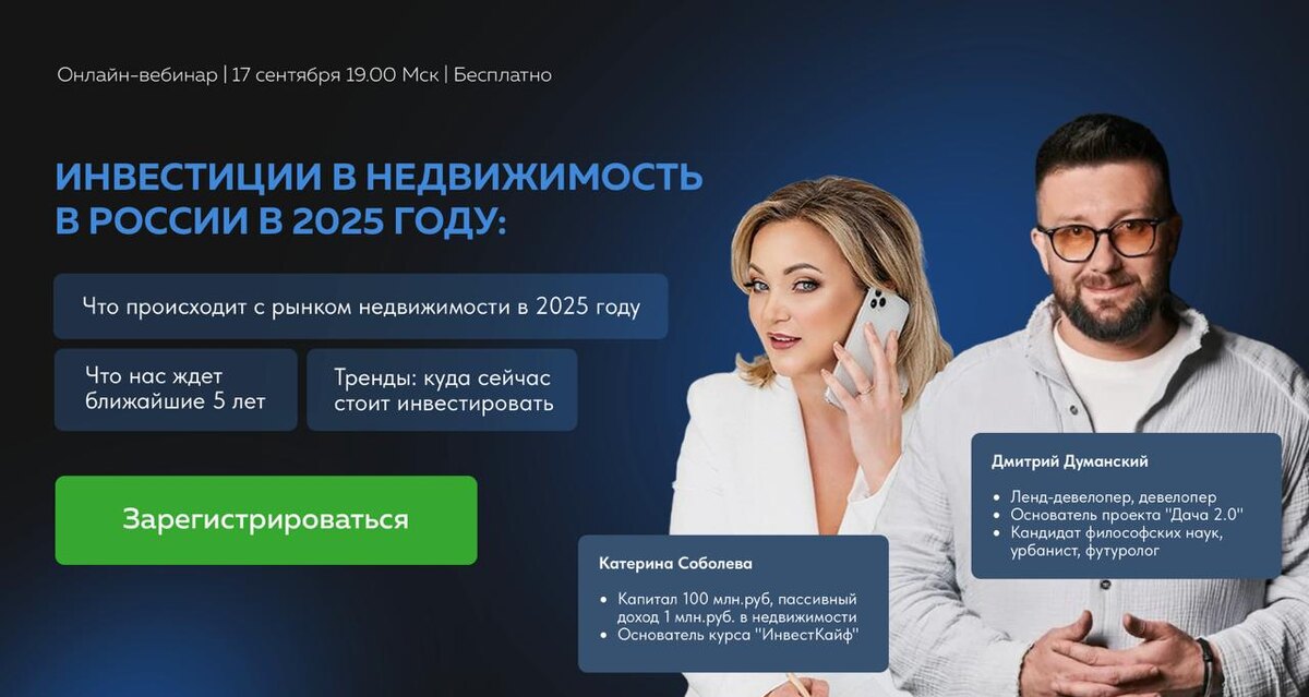 🌍 Тренды, которые решат, где будут деньги в ближайшие 3–5 лет 17 сентября в 19:00 мы с Дмитрием Думанским проведём вебинар «Куда инвестировать в недвижимость в 2025 году?». Последние недели я много говорила о земле. Но давайте честно - вас интересует не только «почему земля», а куда в целом движется рынок и какие тренды определят ближайшие годы. 📌 На эфире мы покажем: - куда реально смотрит государство: инфраструктура, агломерации, внутренний туризм, поддержка ИЖС; - куда движется население: рост пригородов, миграция из крупных городов, спрос на доступные форматы; - почему именно земля на стыке этих процессов становится самым выигрышным активом. 👉 Регистрируйтесь - https://investkaif.ru/ikzwebinar И да, я наконец отвечу на все вопросы, которые чаще всего пишете в комментариях и в личку: ❓Можно ли заходить в быстрые инвестиции в землю? ❓Землю точно не отберёт государство? ❓А как быстро её потом продать? 🎁 В финале дам каждому участнику PDF-компас по инвестициям в недвижимость: