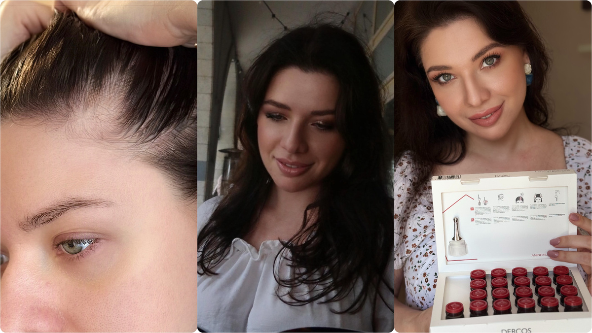 А тем временем моя кожа головы светилась… и трихолог ставит мне АГА второй стадии…. Коллаж ниже: мои волосы и моя кожа головы в начале лечения..