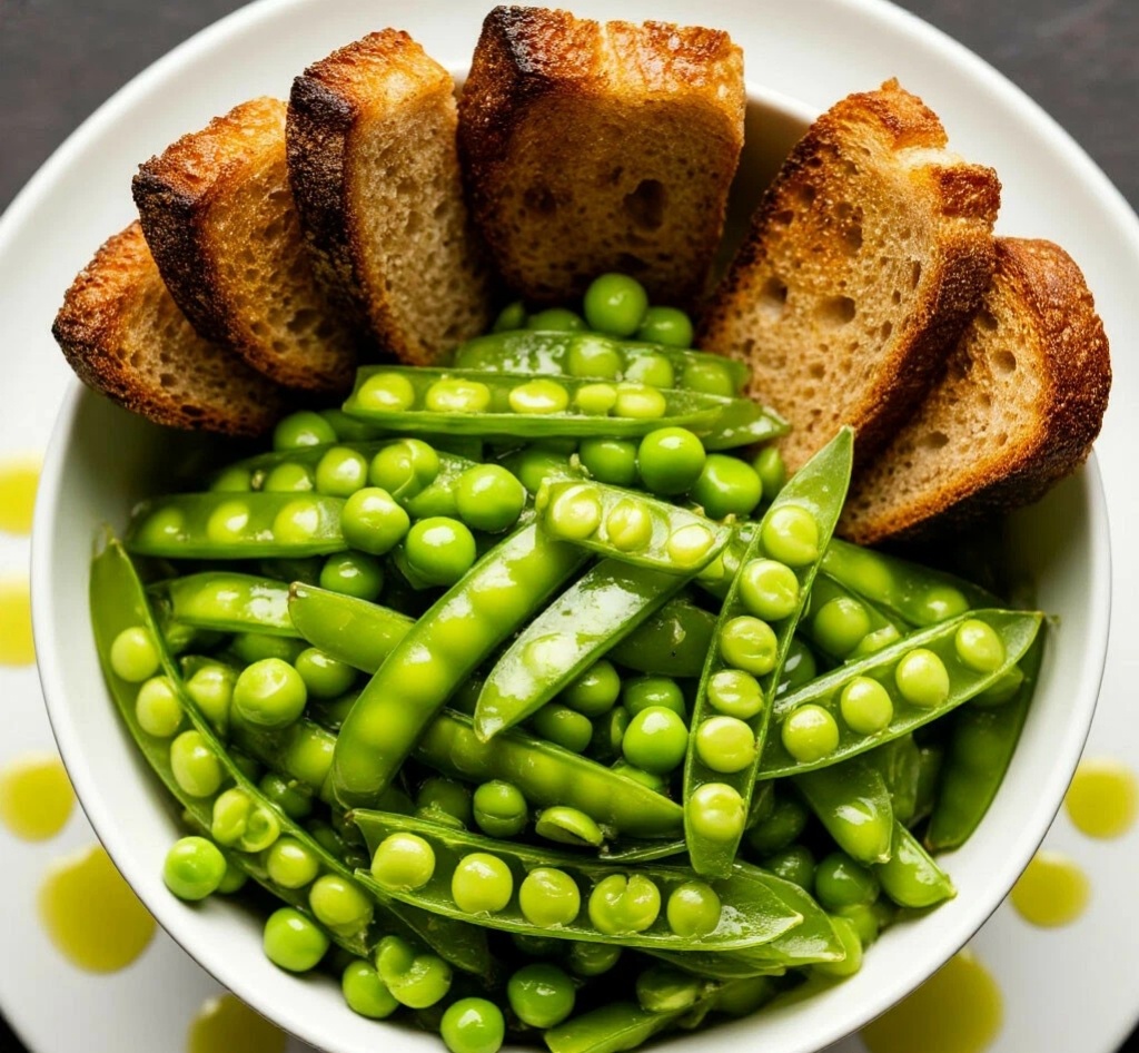 Ингредиенты: 450 г стручков зеленого горошка 2 маленьких листовых салата 3 луковицы зеленого салата подсолнечное масло белый винный уксус черный перец 1 ящик садового кресс-салата 2 куска хлеба 1 зубчик чеснока и сливочное масло Способ приготовления: 1. Очистите и нарежьте лук на тонкие кольца. 2. Положите лук на сковороду с небольшим количеством подсолнечного масла. Обжаривайте на среднем огне до золотистого цвета. 3. Выложите обжаренный лук на бумажное полотенце, чтобы удалить лишний жир. 4. Нарежьте хлеб на кубики и обжарьте на сковороде с небольшим количеством сливочного масла. 5. Посолите и поперчите по вкусу. 6. Разрежьте чеснок пополам и раздавите его ножом. 7. Добавьте чеснок на сковороду с хлебом. Обжарьте до золотистого цвета и добавьте в салатницу. 8. Нарежьте стручки зеленого горошка на кусочки и добавьте их в салатницу вместе с листьями салата, зеленым луком и садовой укропом. 9. Сбрызните салат белым винным уксусом и подсолнечным маслом. 10. Хорошо перемешайте и подав