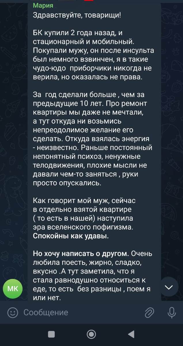У меня два приборчика - стационарный и мобильный. Про стационарный писала выше свои ощущения. Что касается мобильного прибора - брала его на репетиции и концерты (работаю в шоу-бизе). Чего-то кардинального не заметила, НО - точно могу сказать, что с прибором нет нервяков, другие музыканты не лезут с советами, как мне лучше играть (бывают и такие). Ощущение того, что про меня забыли "в хорошем смысле". Я делаю свое дело и ко мне никто не лезет и не акцентирует на мне внимание. Чувствую себя гораздо спокойнее, чем раньше, ушли самокопания и неуверенность. Большое спасибо создателям этих приборов 🌞🌞🌞