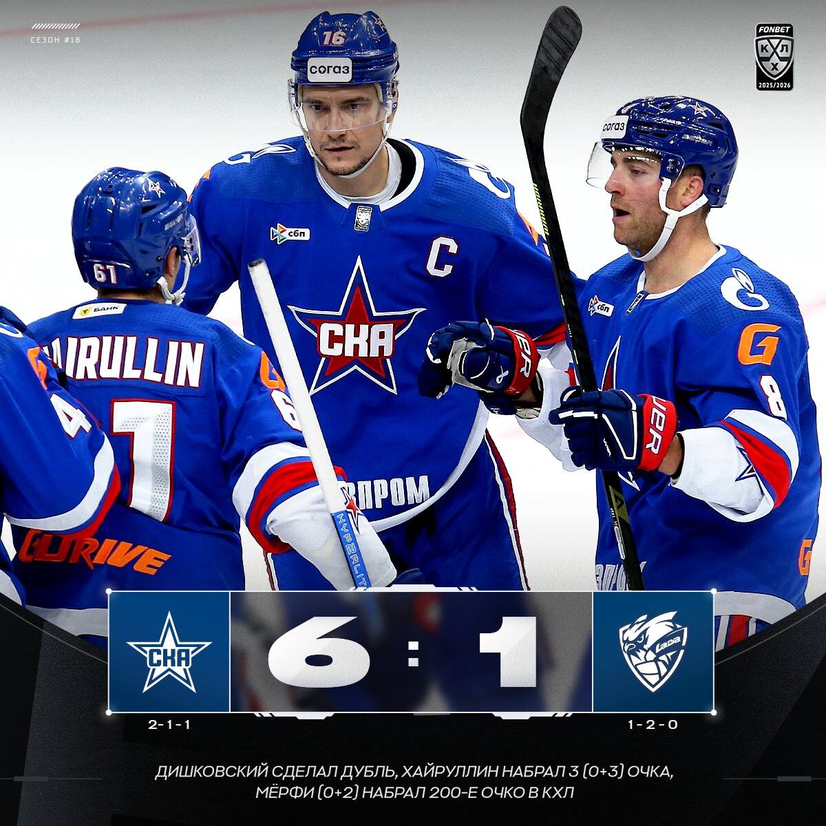 ⭐️ Дубль Дишковского, три очка Хайруллина и юбилей Мёрфи — СКА одерживает победу над «Ладой»!