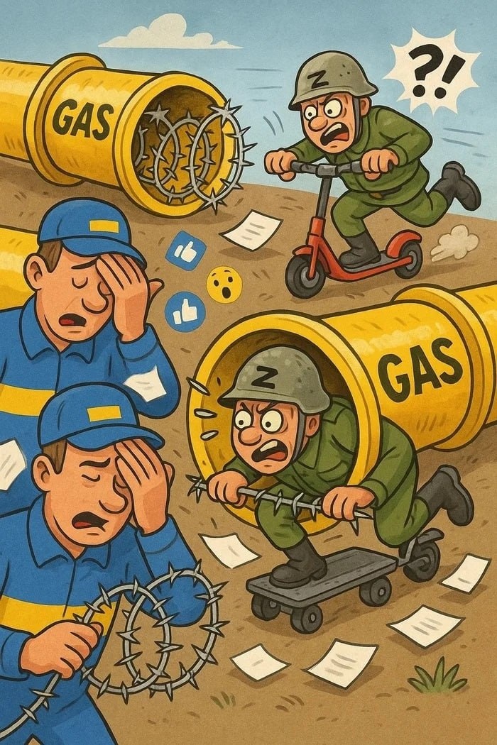 Газовые трубы, спирали Бруно и украинская фантазия на фронте На Украине придумали новый способ обезопасить тылы от русских солдат. Решили ставить внутри газопроводных труб спирали Бруно — колючую проволоку. Идея, вроде бы, проста. Бойцы захотят прокатиться по трубе, получат пару колючих сюрпризов и задумаются, а стоит ли вообще идти в тыл. Причиной таких изобретений стали реальные случаи, когда русские использовали газовые трубы для передвижения на тележках и электросамокатах, проникали в тыл ВСУ и заставляли украинские подразделения отступать. Настоящая «операция Поток», только мини-формат и с элементами шоу. Четыре дня напряжённой работы и тылы чуть не рассыпались от ударов. Но реакция общественности не заставила себя ждать. Соцсети взорвались смехом: лайки «смеюсь» оказались в два раза больше, чем одобрительные. Комментаторы предлагали альтернативные решения: — Пускайте газ по трубам, а закупки делайте у России. — Построим деревянный забор на передовой — недорого и символично.