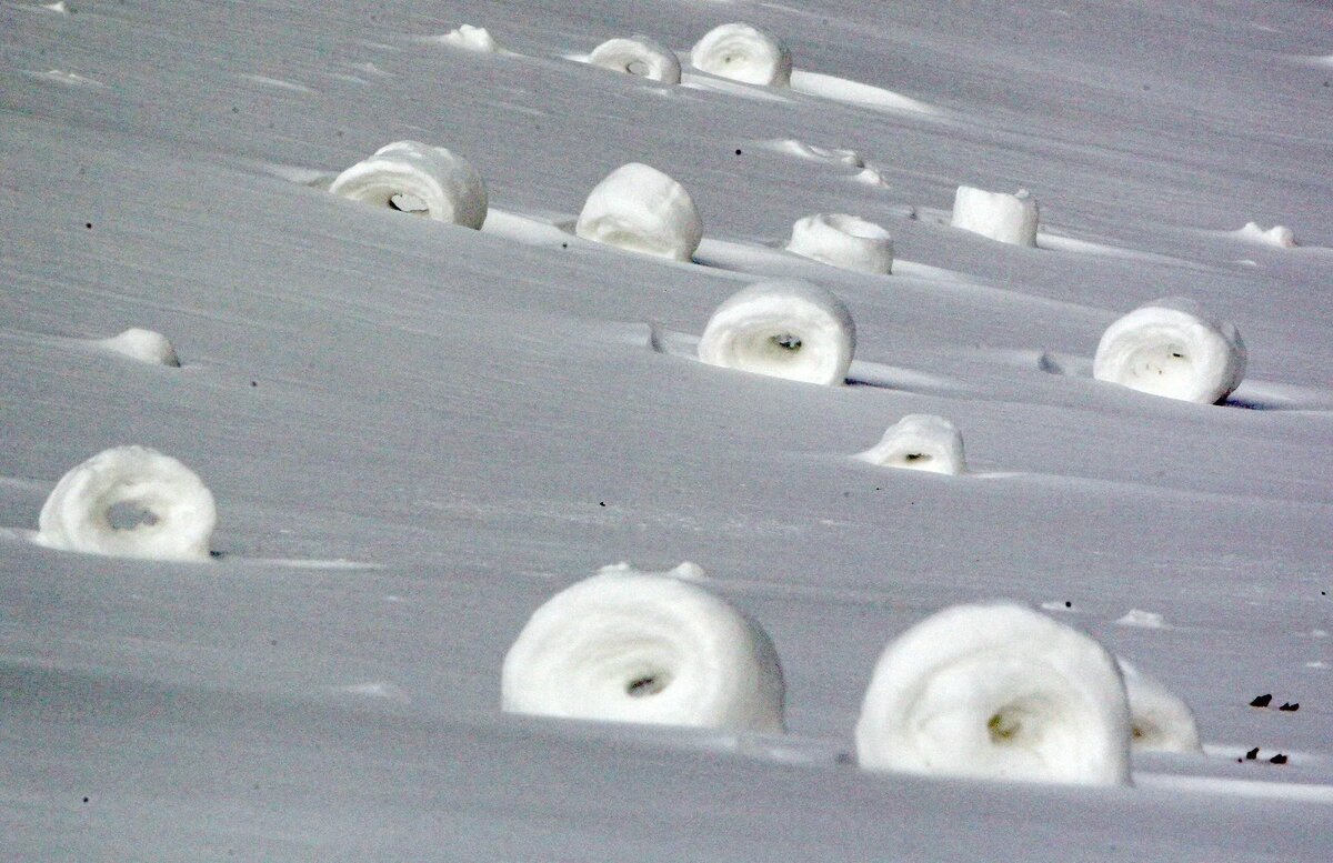 Снежные рулоны (или снежные «бублики», англ. snow rollers) — это естественно образовавшиеся цилиндры из снега. Внешне они напоминают картонные трубочки, обмотанные тонким пластом снега. Диаметры могут быть от нескольких сантиметров до нескольких десятков сантиметров, а длина — несколько десятков сантиметров и больше. Внутренняя «полость» образуется потому, что слой снега сначала приклеивается к поверхности, затем скатывается и наматывает на себя новые слои снега. 🌬️❄️