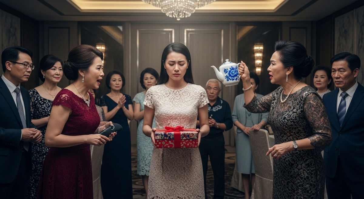 Елена стояла посреди зала, сжимая в руках красивую коробку с подарком. Она чувствовала, как кровь приливает к лицу, а внутри всё сжимается от стыда. На неё смотрели десятки глаз — кто с любопытством, кто с насмешкой. Клавдия тем временем размахивала только что распакованным чайником с синей росписью и театрально закатывала глаза.